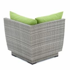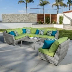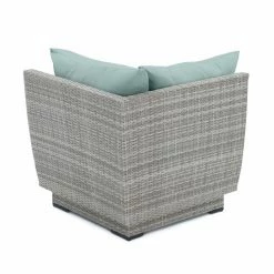 Perfect for entertaining, the RST Outdoor Cannes Bliss 6 Piece Corner Sectional Set is an elegant addition to any home. Sophisticated weathered grey wicker is beautifully set off by the Sunsharp cushions, in the color of your choice; creating a quiet, outdoor environment. Made from hand-woven polyethylene (PE) wicker over a strong, lightweight, rust-resistant, powder coated aluminum in a rich bronze color, this set is UV-, fade-, and weather-resistant. Designed to hold up great in salty and chlorinated environments, this set is ideal for pool and seaside relaxation. Sunsharp cushions are not only soft and comfortable, but are also covered in breathable fabric that dries quickly, helping to avoid mildewing. Cool to the touch, even in the middle of summer, PE wicker is not only practical but also adds an element of sophisticated style and elegance to your outdoor furniture. Crafted from 100% recyclable material, this gorgeous set requires very little assembly, ensuring that you’ll be outdoors enjoying the warm weather in no time.