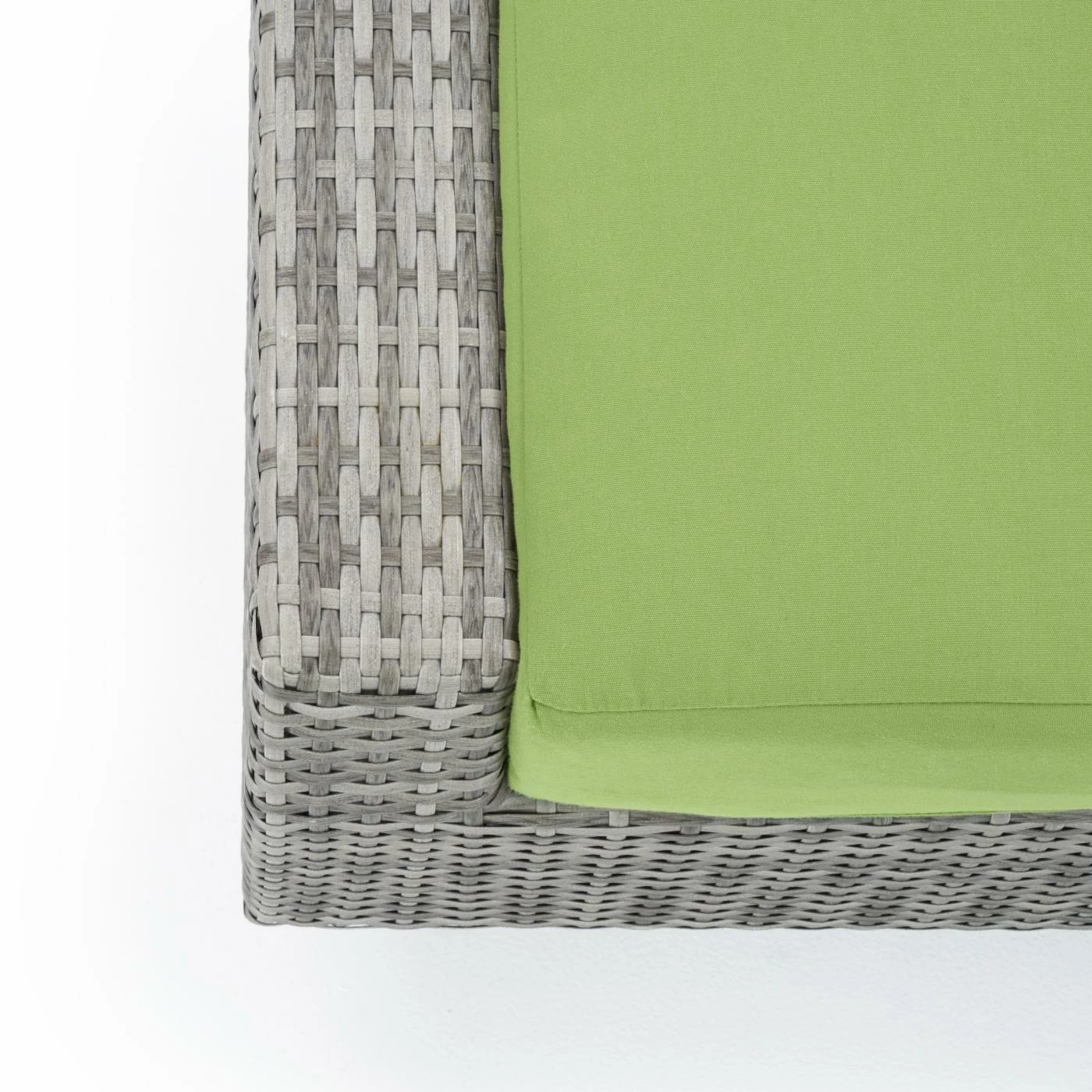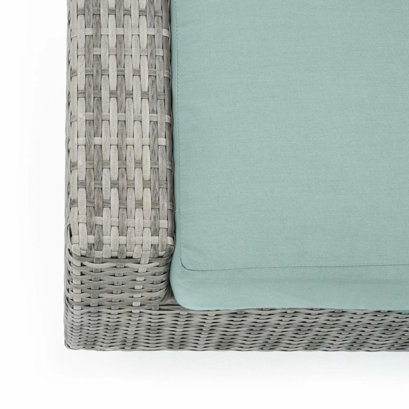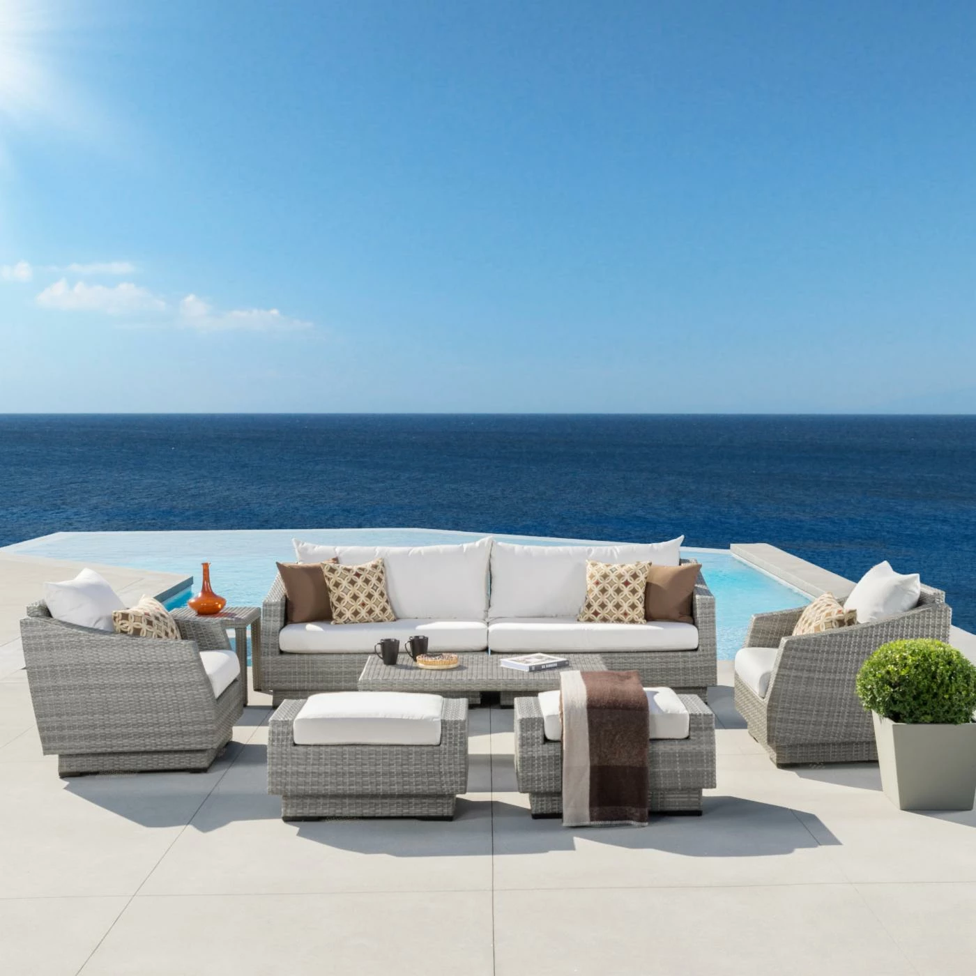 Spend hours outdoors enjoying the warmth and peace of summer while relaxing on the elegant, sophisticated RST Outdoor Cannes Bliss 8 Piece Sofa Conversation Set. Beautifully designed, this sophisticated set is crafted from gorgeous, hand-woven polyethylene (PE) wicker over a strong, lightweight, and rust-resistant aluminum frame in a rich, powder-coated bronze color. Its elegant grey wicker is perfectly accented by the soft and comfortable cushions. Made from breathable fabric that is easy to clean and offered in a range of colors, these cushions are made to dry quickly to help avoid mildewing. UV-, fade-, and weather-resistant, this set holds up great in salty and chlorinated environments, making it ideal for pool and seaside relaxing. PE wicker is cool to the touch, even in hot weather, making it a comfortable place to relax at any time of the day. Made from 100% recyclable material, this set will beckon you outdoors to enjoy your first cup of coffee while watching the sun rise or call you to a quiet retreat away from the business of life.