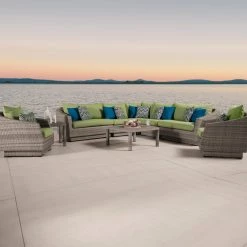 Once the RST Brands Cannes 9 Piece Sectional Conversation Set arrives, you might start spending every spare moment on the patio. This complete set features a pair of club chairs around a wide, 90-degree sectional with matching coffee and side tables. Each piece is crafted around a frame of rust-proof aluminum, giving you a set that’s made with the rigors of the outdoors in mind. On these sturdy frames is an exterior of woven polyurethane wicker, a synthetic material that’s cool to the touch, even in the middle of summer, PE wicker is not only practical but also adds an element of sophisticated style and elegance to your outdoor furniture. Each of the eight chairs sports thick cushions of dense foam that are wrapped in covers of Sunbrella fabric. Offered in a range of colors, the Sunbrella fabric line is designed to be fade-resistant and tough-wearing, making it the perfect choice for outdoor seating.