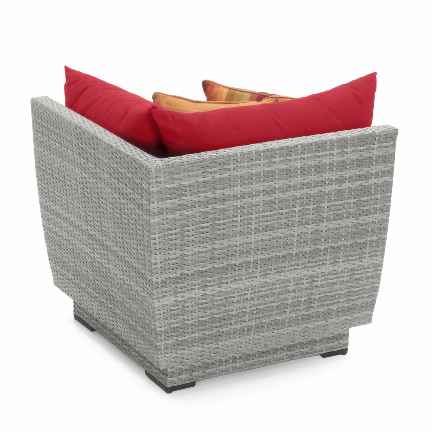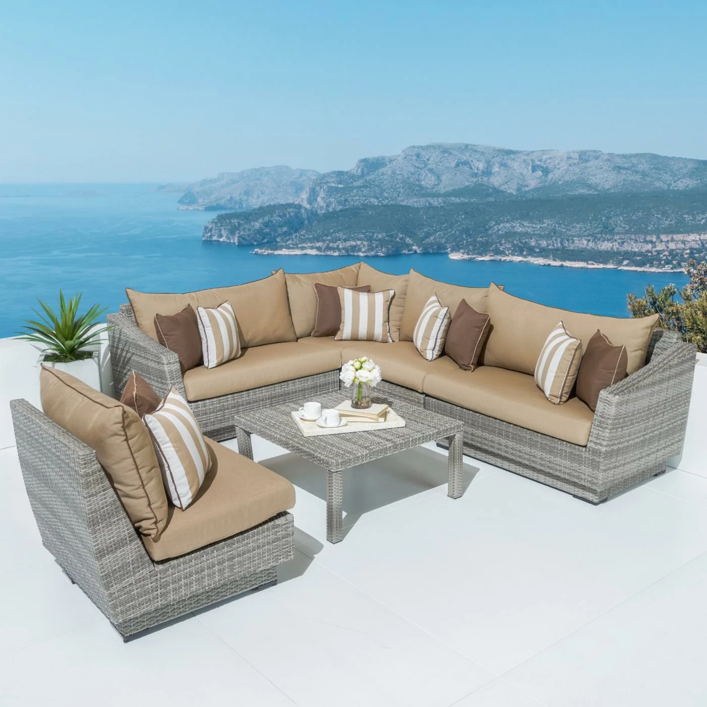 The RST Brands Cannes 6 Piece Sectional Patio Conversation Set offers functionality with modern style. This patio conversation set boasts seating for up to seven people on plush multi-layer foam cushions. Each cushion is covered in a fade- and weather-resistant fabric in your choice of available colors. Coordinating accent pillows provide extra support and a pop of visual texture. A durable, powder-coated aluminum frame is designed to last through all seasons. Hand-woven resin wicker in a two-tone gray color is as easy to clean as it is attractive. Configure this charming set in whatever arrangement best suits your outdoor space and style.