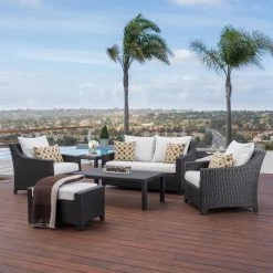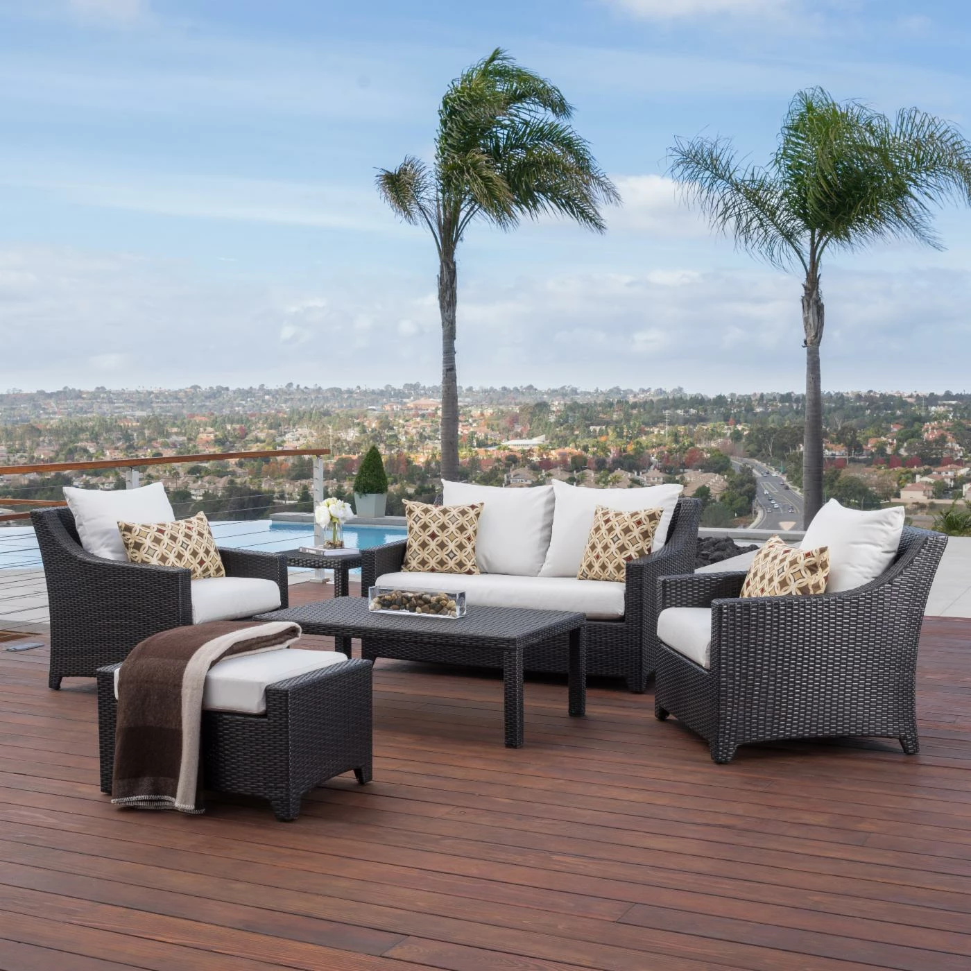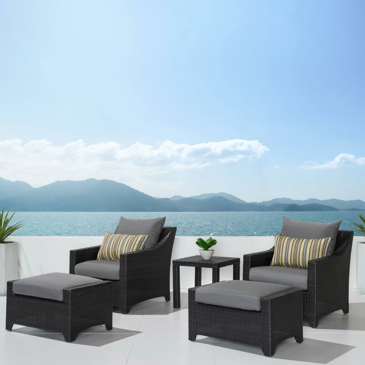 Bring the cool, calm style of the RST Outdoor Tikka 5 Piece Club Chair and Ottoman Set to your home to enliven your patio, deck, or garden. This handsome alfresco patio set effortlessly blends a simple and clean modern design with the classic charm of deep comfort. Constructed from 100-percent recycled rattan wicker, this eco-friendly set features hand-woven wicker with durable aluminum frames. For longevity of use, the powder-coated frames are rust-resistant and lightweight, for a durable yet graceful set. The rich espresso frames elegantly complement any of the available fabric options, bringing a simple, sophisticated energy to any patio, deck or poolside space. For year-round enjoyment, the PE wicker remains cool-to-the-touch for comfortable and safe use.