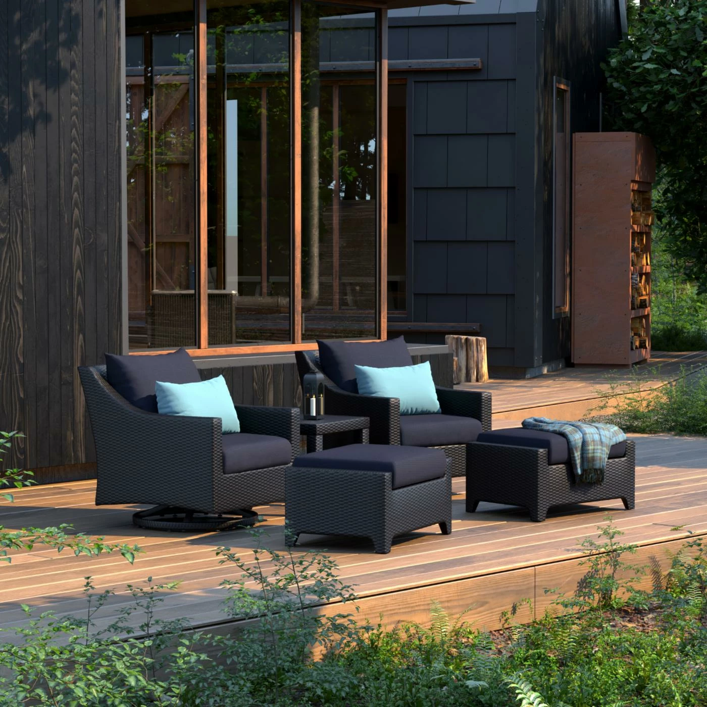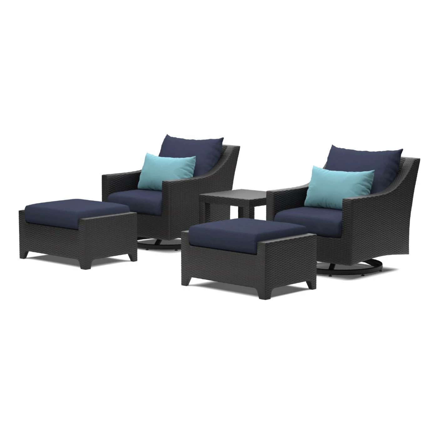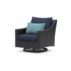 With 360 degrees swivel and rocking chairs, the RTS Brands Deco 5 Piece Motion Club Chair and Ottoman Conversation Set will become an ideal place to put your feet up and relax outdoors. This set comes with your choice of colored outdoor cushion that is weather resistant for long lasting outdoor use. It is constructed of durable powder-coated aluminum and resin wicker with a modern look that will complement your patio or deck space.