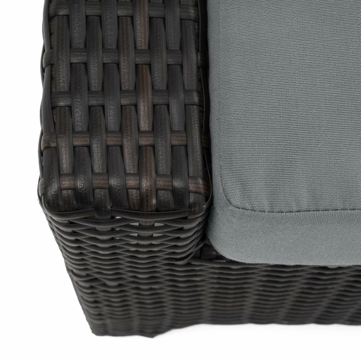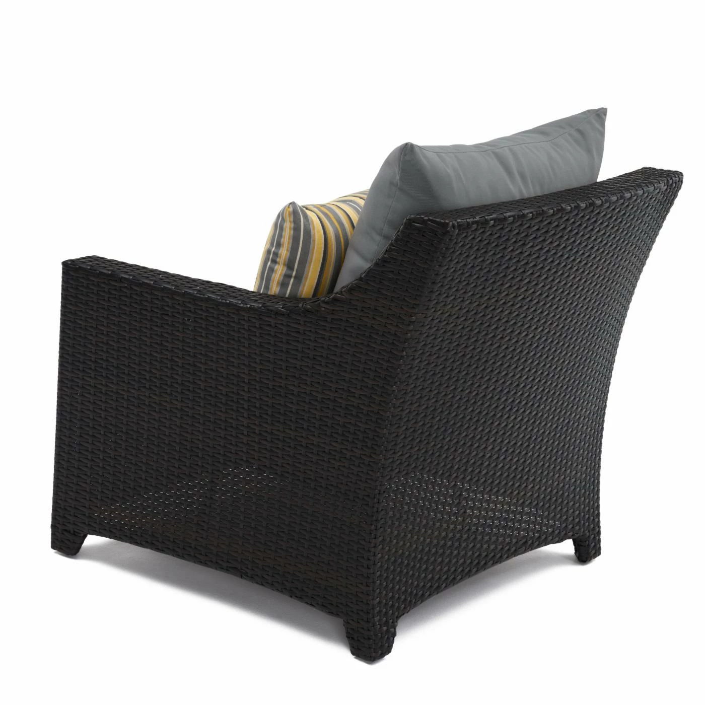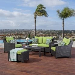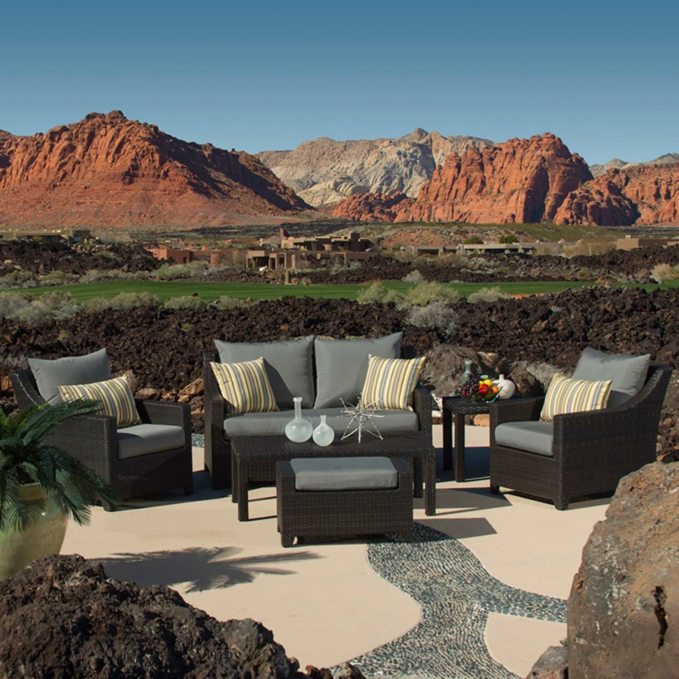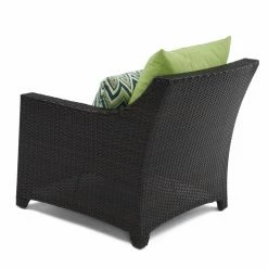 Turn your backyard into a modern relaxation space with the RST Outdoor Tikka 6 Piece Loveseat and Club Chair Set. This handsome alfresco patio set effortlessly blends a simple and clean modern design with the classic charm of deep comfort. Constructed from 100-percent recycled rattan wicker, this eco-friendly set features hand-woven wicker with durable aluminum frames. For longevity of use, the powder-coated frames are rust-resistant and lightweight, for a durable yet graceful set. The rich espresso frames elegantly complement the wide range of fabric options, bringing a simple, sophisticated energy to any patio, deck or poolside space. For year-round enjoyment, the PE wicker remains cool-to-the-touch for comfortable and safe use.