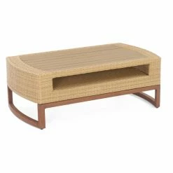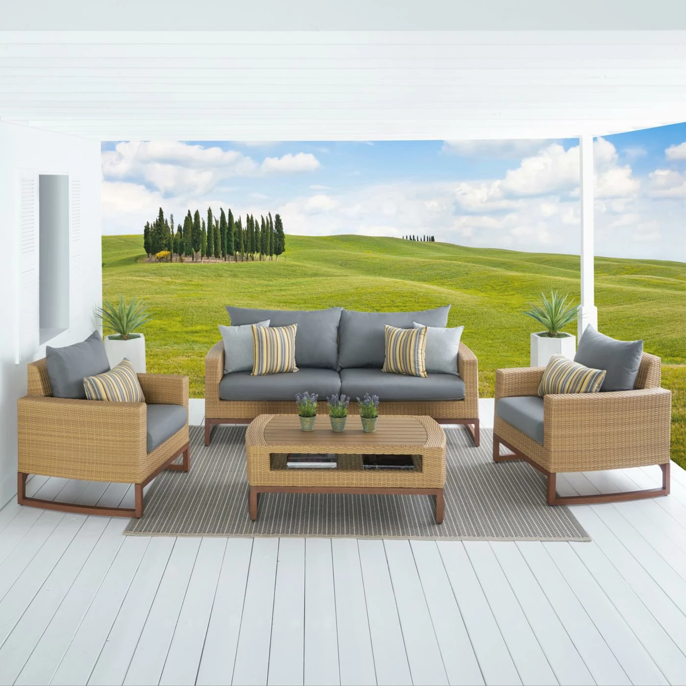 Settle in for hours of conversation and companionship with the RST Brands Mili Wicker 4 Piece Patio Conversation Set. This four-piece chat set includes two club chairs, one two-person loveseat, and a slatted coffee table with a lower shelf.