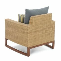 Powder-coated aluminum frames – sturdy, durable, and resistant to rust – form the backbone of each piece. The exposed aluminum frames have faux wood finishes which pair well with the Viro wicker’s pale beige shade. Viro resin wicker, which lasts up to five times longer than other wickers, holds fast against fading, chipping, rotting, and sun damage. Comfy Sunbrella cushions (fade resistant and weather safe) come in your choice of available colors. In addition to the chair and loveseat cushions, this set comes with coordinating accent pillows.