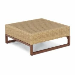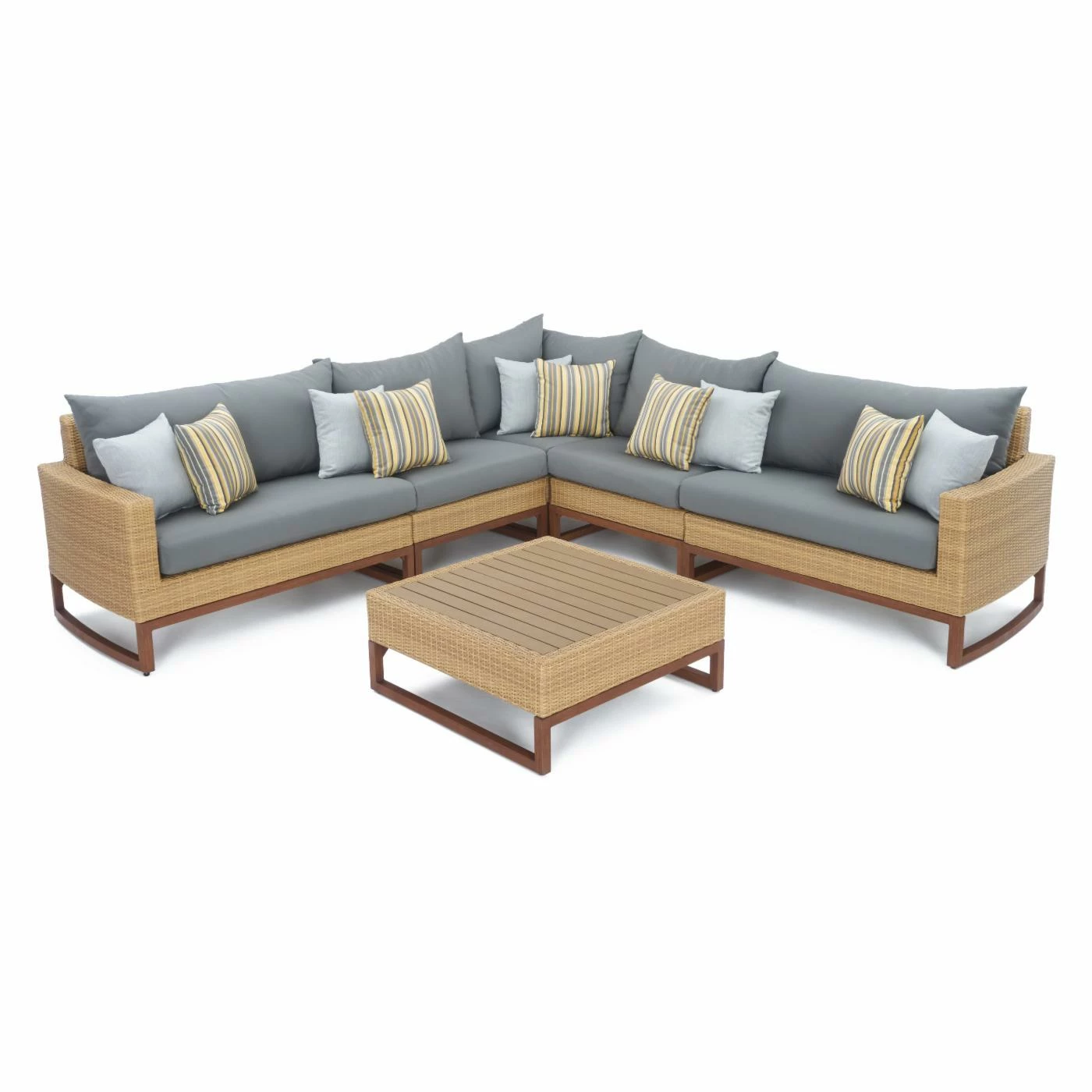 The RST Brands Mili Wicker 6 Piece Sectional Patio Conversation Set is a sectional the entire family can get comfortable on as it easily fits six to seven people. Powder-coated aluminum frames – sturdy, durable, and resistant to rust – form the backbone of each piece. The exposed aluminum frames have faux wood finishes which pair well with the Viro wicker’s pale beige shade.