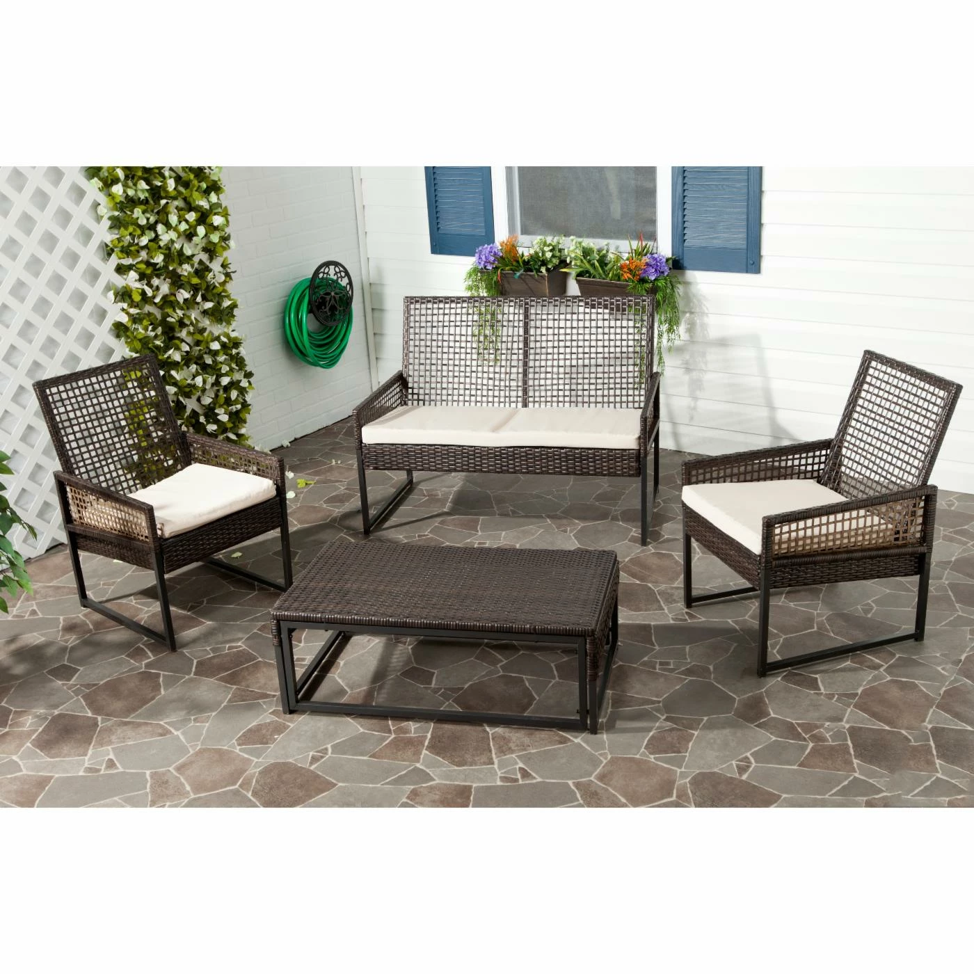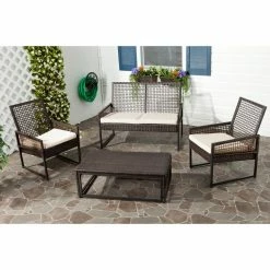 Kick back and relax in the Safavieh Shawmont Conversation Set as you and your friends really sink into casual congenial conversation. This set is specifically designed to set loungers at ease with slightly angled seats and comfortable Terylene fabric cushions. Whether you’re serving coffee and tea or evening nightcaps, the roomy coffee table provides plenty of surface space for everyone to be able to set their drinks and plates down.