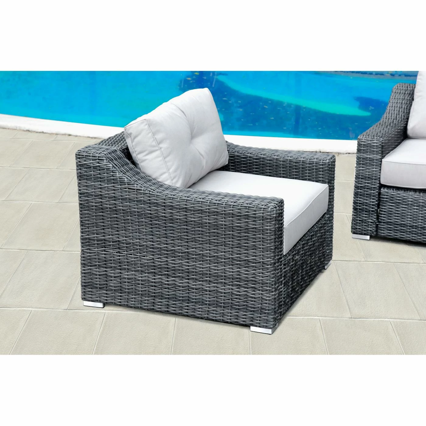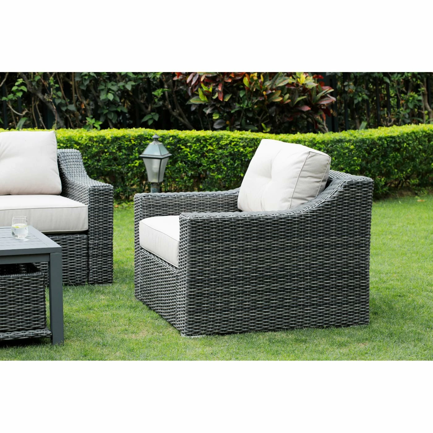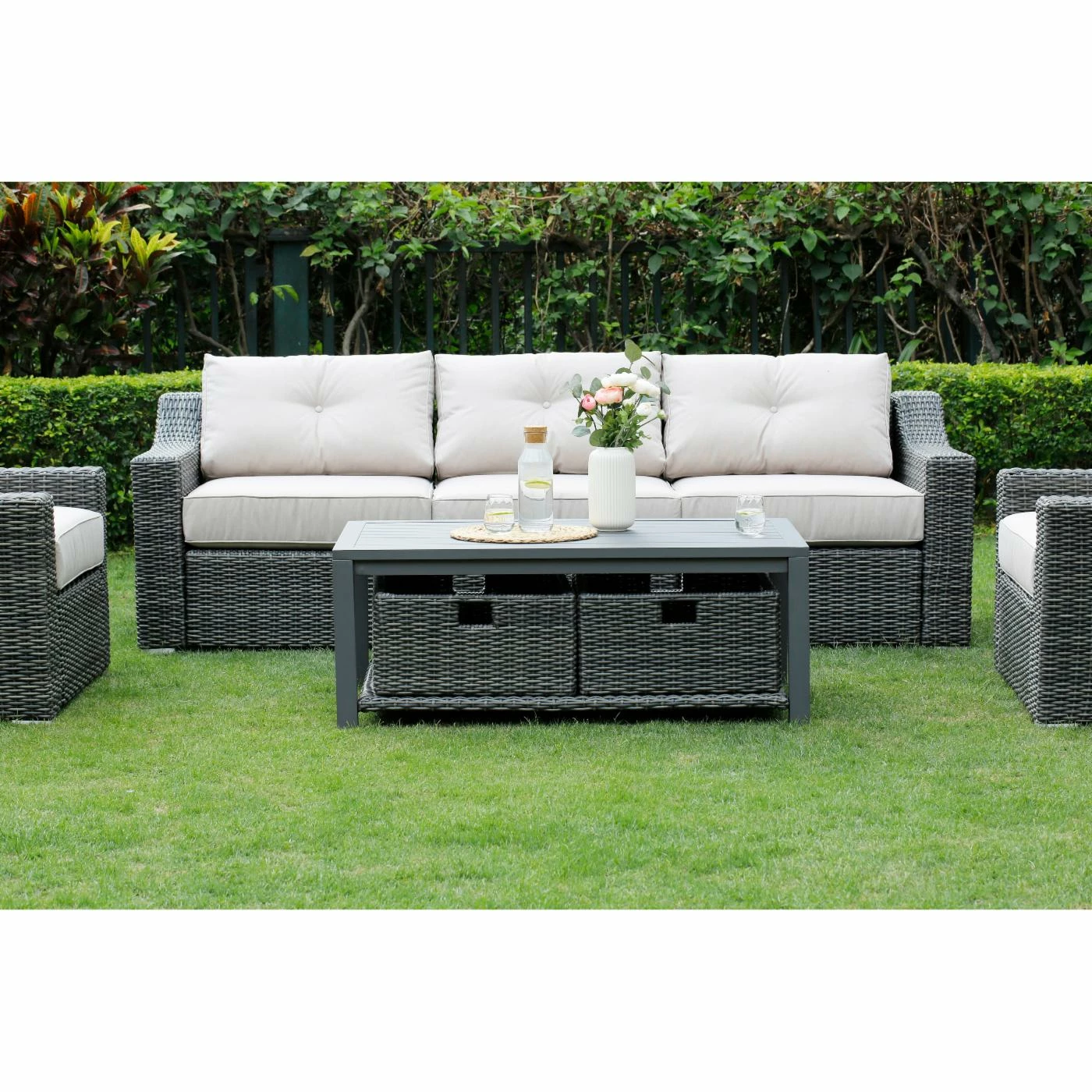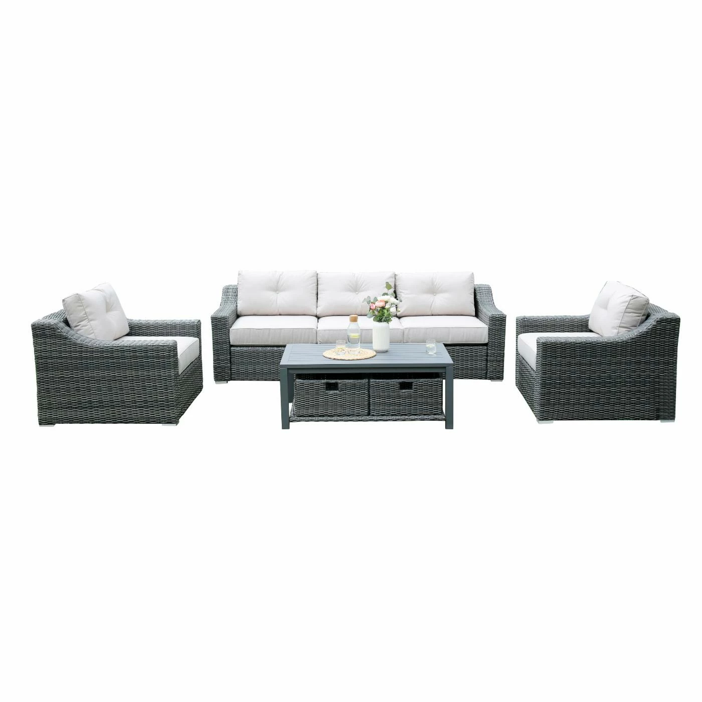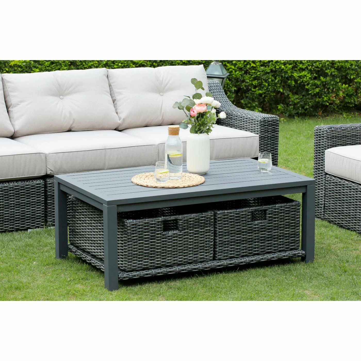 - Constructed of warm gray resin wicker and aluminum