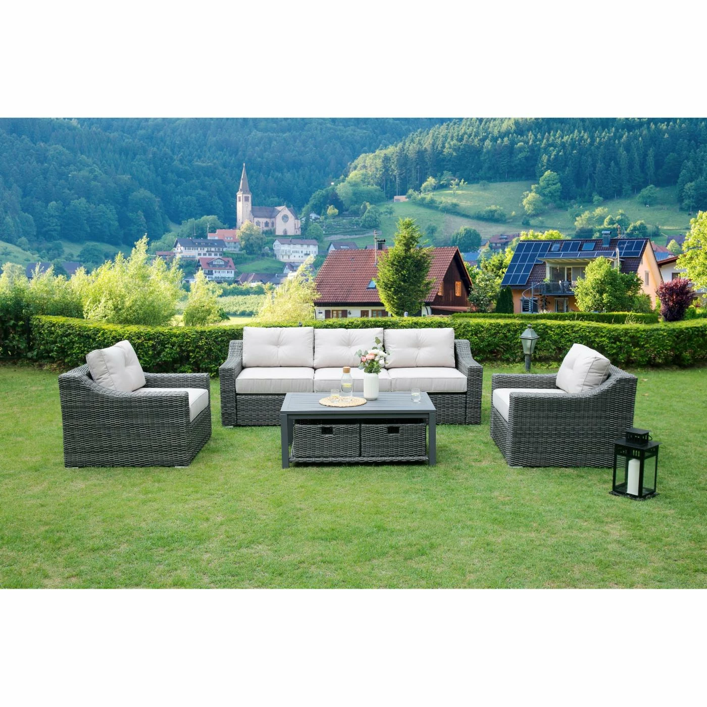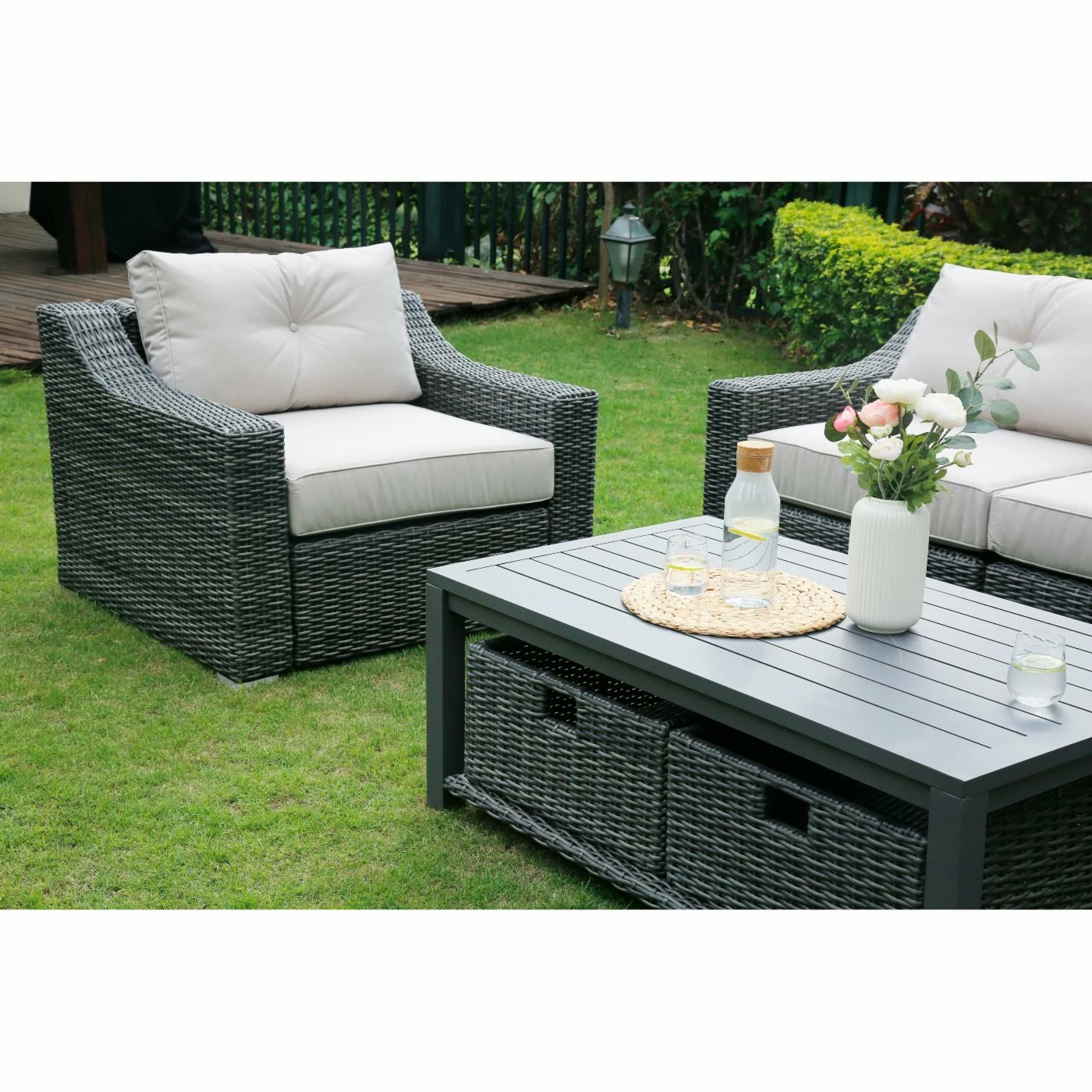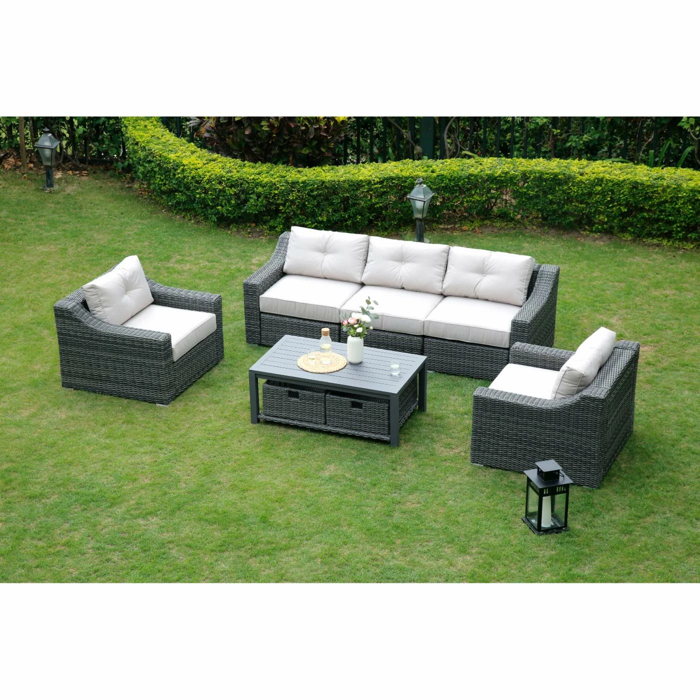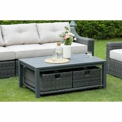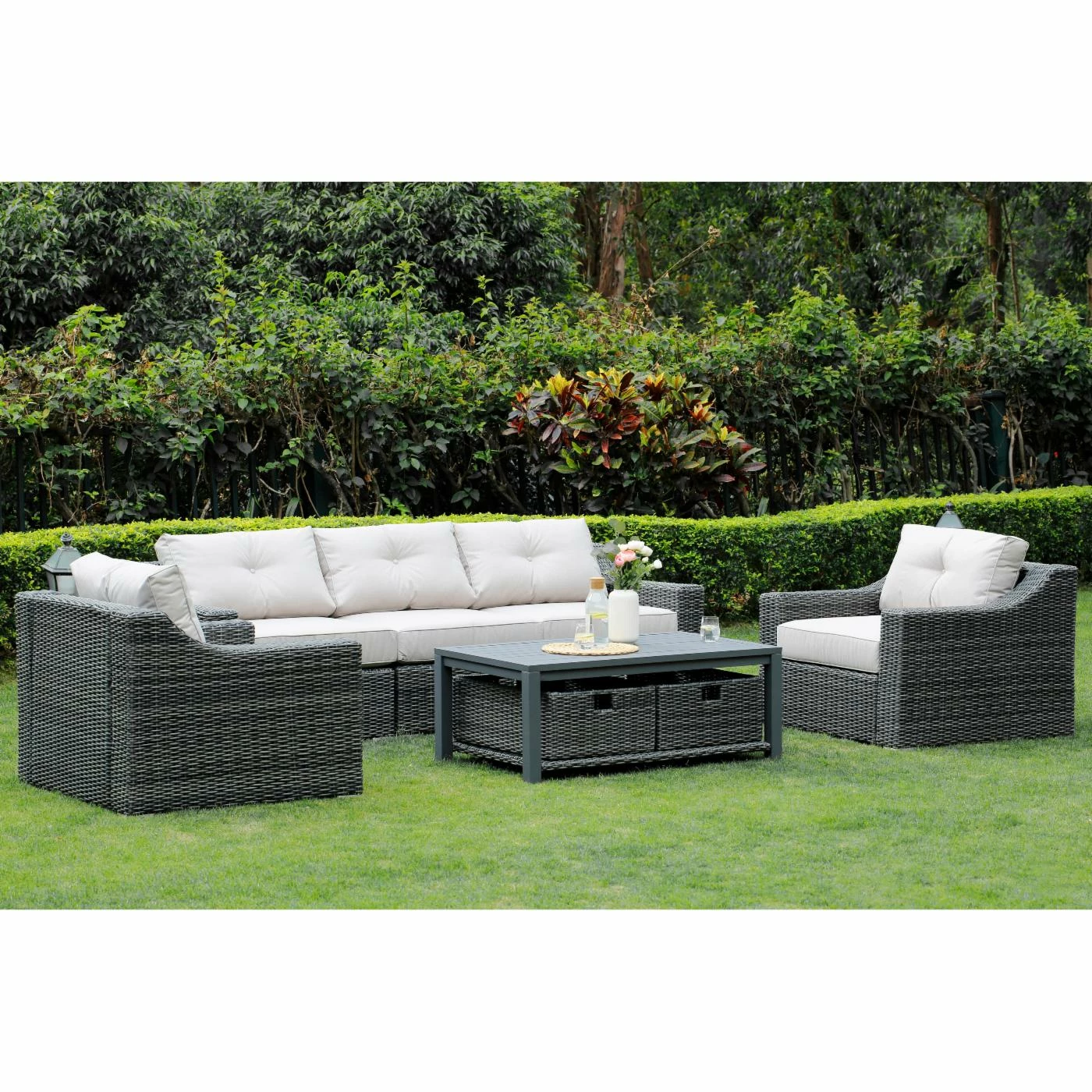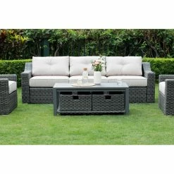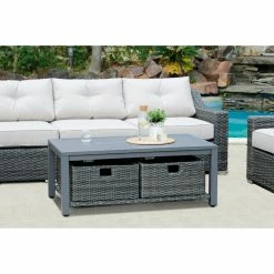 Create a relaxing outdoor place for friends and family to gather. Slope arms give the SHINERICH Northgate 6 Piece Resin Wicker Conversation Set an easy, updated style. The Grand Sofa & Lounge Chairs are handwoven using a durable synthetic with a variegated warm gray finish that replicates the look and chunky feel of the wicker. With its thick cushions, fully woven coffee table with an aluminum slat top, this collection is meant for stylish and comfortable entertaining. Features slope arm. Hand-woven from durable synthetic that replicates the look and feel of wicker, but is remarkably resistant to sun, rain, heat, and cold. The frame is crafted of heavy-duty rust-proof welded aluminum material. All-weather wicker is sealed with clear lacquer for moisture resistance. Imported olefin fabric cushions ensure a great look, and are UV resistant.