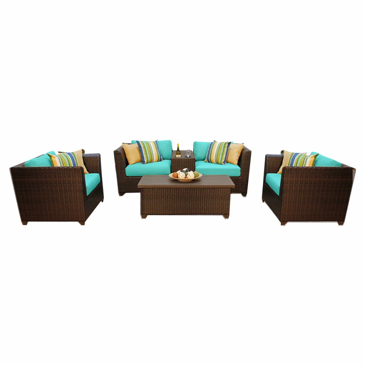 The TK Classics Barbados Wicker 6 Piece Patio Conversation Set with Coffee Table and 2 Sets of Cushion Covers is ideal for anyone who loves to entertain. With ample seating, you and your friends will sit in comfort while enjoying drinks and each otherβs company. Strong and durable, each piece has a rust-resistant aluminum frame covered in custom, hand-woven, all-weather, high-density polyethylene wicker finished in a rich espresso which complements almost any dΓ©cor. Thick cushions are covered in wheat-colored cushion covers and come with a second set of covers in your choice of available color so you can add a pop of color to accent the natural beauty of your backyard. Use the built-in cup holders on the cup table to hold your drinks while the included coffee table is perfect for holding decorations, books, plates, and more. The no sag wicker bottom on each piece has extra flexible strapping to provide long-lasting suspension while the feet feature height adjusters for uneven surfaces that wonβt mar your patio or deck. Whether youβre enjoying your first morning cup of coffee alone or having drinks with a friend, this set gives you a luxurious place to do so.