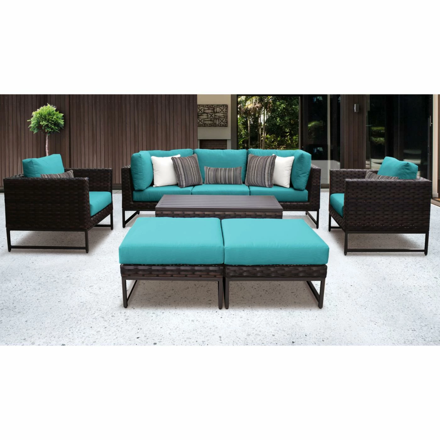 Your outdoor seating arrangement will be customized to your space with the TK Classics Barcelona 08c 8 Piece Wicker Outdoor Patio Conversation Set. Combine the left-arm chair, right-arm chair, and armless chair to create a spacious sofa. The two club chairs feature a square design with a straight back and arms. The two ottomans may be used to extend the sofa and use as footrests or on their own to as extra seats for your guests. Place a small plant, drinks, or snacks on the slat top of the coffee table. The durable powder-coated aluminum frames will standup to the harsh outdoor weather with their high-density polyethylene wicker in a walnut finish.
