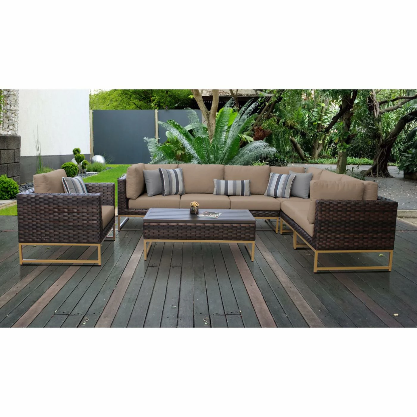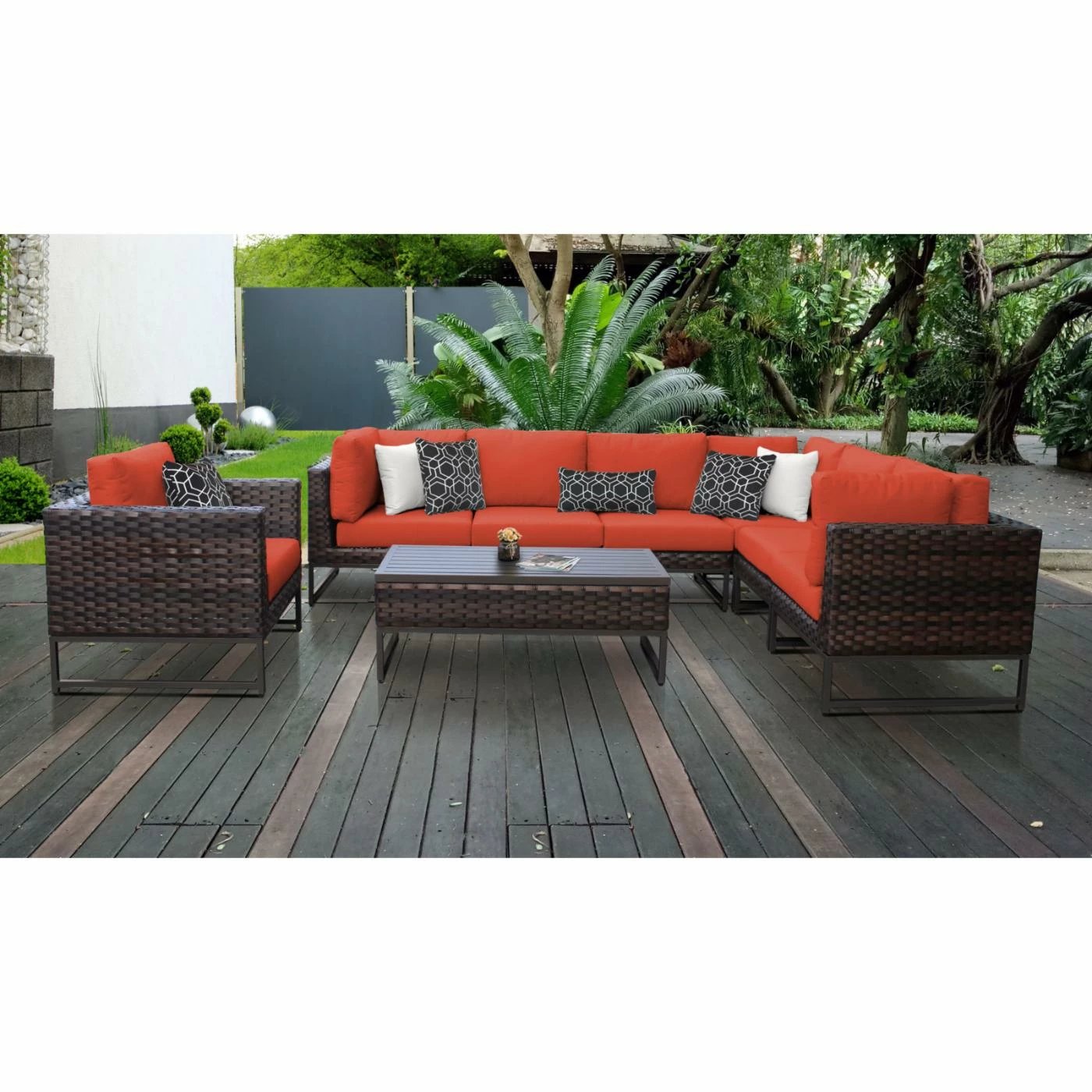 Control your outdoor space by arranging and rearranging the TK Classics Barcelona 08d 8 Piece Wicker Outdoor Patio Conversation Set. Combine the three armless chairs, left-arm chair, right-arm chair, and corner chair to create an L-shaped sofa. The club chair features a square design with a straight back and two arms. Place a small plant, drinks, or snacks on the slat top of the coffee table. The durable powder-coated aluminum frames will standup to the harsh outdoor weather with their high-density polyethylene wicker in a walnut finish.