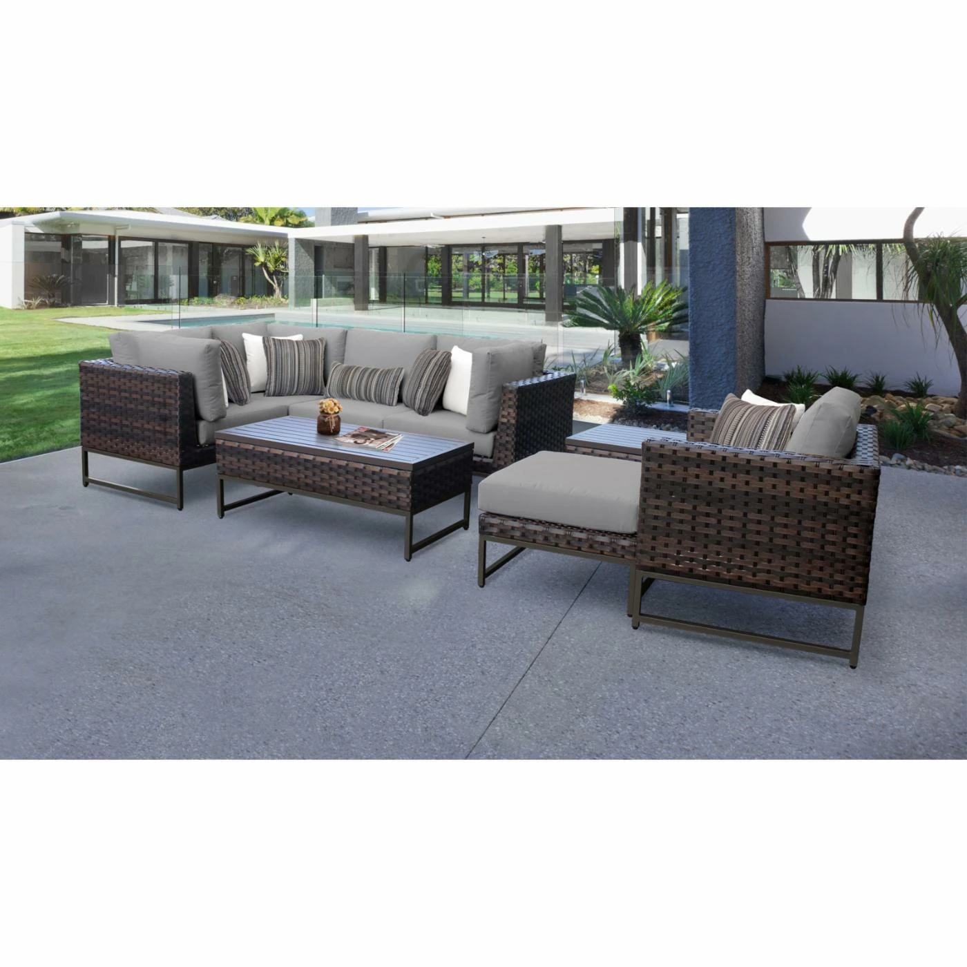 The versatile TK Classics Barcelona 08n 8 Piece Wicker Outdoor Patio Conversation Set may be swapped around for your outdoor needs. The included pieces may be used separately or joined together to create a small L-shaped sofa and lounge chair. This patio conversation set includes a left-arm chair, right-arm chair, corner chair, armless chair, and club chair. The ottoman may act as a comfy footrest or an extra seat. The coffee table and end table have a slat top design for you to set down drinks, snacks, and decorations. The durable powder-coated aluminum frames will standup to the harsh outdoor weather with their high-density polyethylene wicker in a walnut finish.