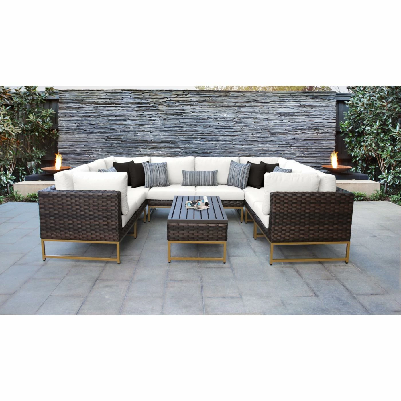 Throw the party of the year and have room for all of your guests with the TK Classics Barcelona 9c 9 Piece Wicker Outdoor Patio Conversation Set in your backyard area. Use the included patio conversation pieces separately or combine them to create a U-shaped sofa with the slat-top coffee table in the middle. This patio set includes four armless chairs, two corner chairs, a left-arm chair, and a right-arm chair. The durable powder-coated aluminum frames will standup to the harsh outdoor weather with their high-density polyethylene wicker in a walnut finish.