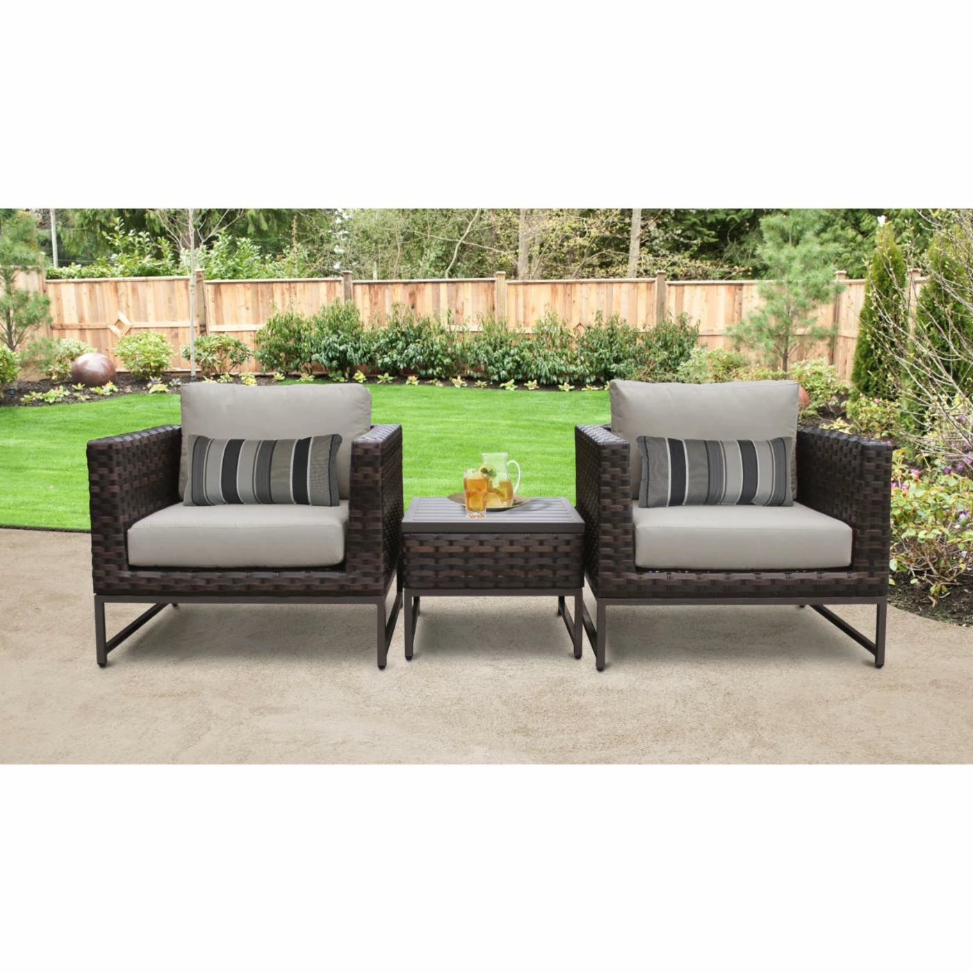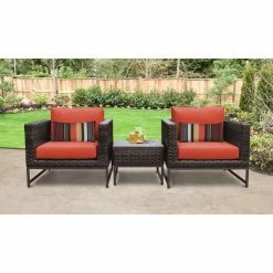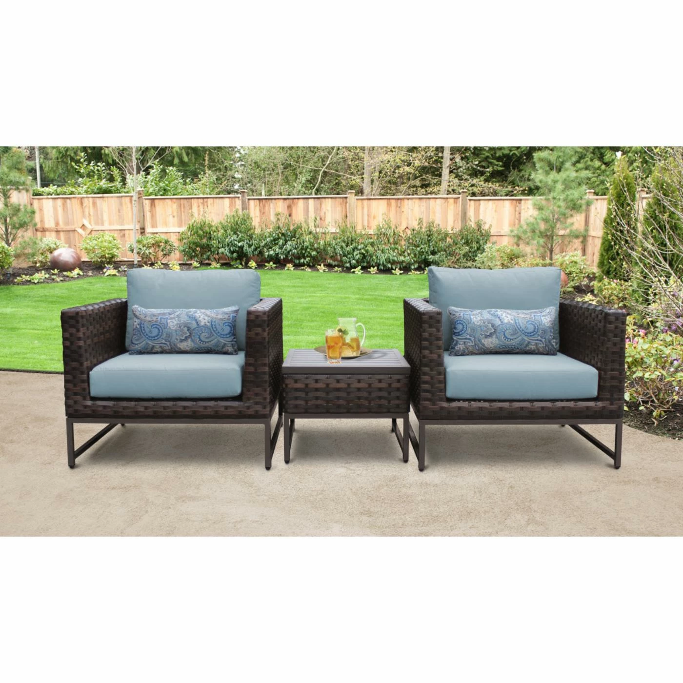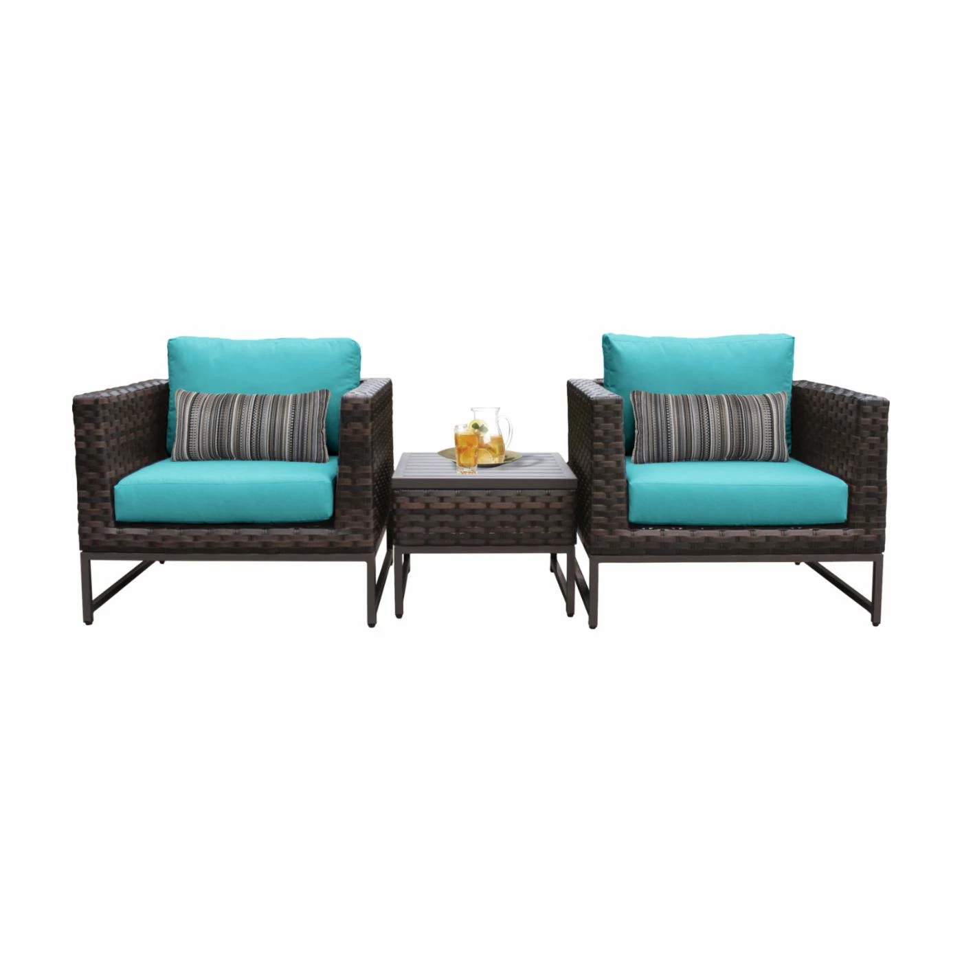 The TK Classics Barcelona Wicker 3 Piece Patio Conversation Set turns an ordinary outdoor space into a lounge area. This set includes two arm chairs and a side table. Each piece is constructed of aluminum with resin wicker wrapped seats. Each chair is topped with yarn-dyed acrylic seat and back cushions. Choose from the available frame finishes and cushion colors to customize the set. Rust-resistant, all-weather materials create durable designs for your patio. Two coordinating throw pillows are included.