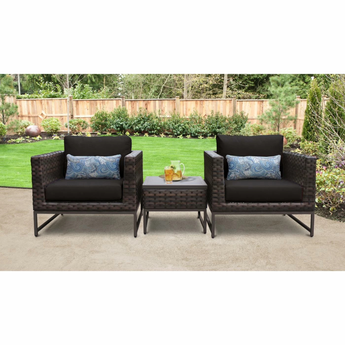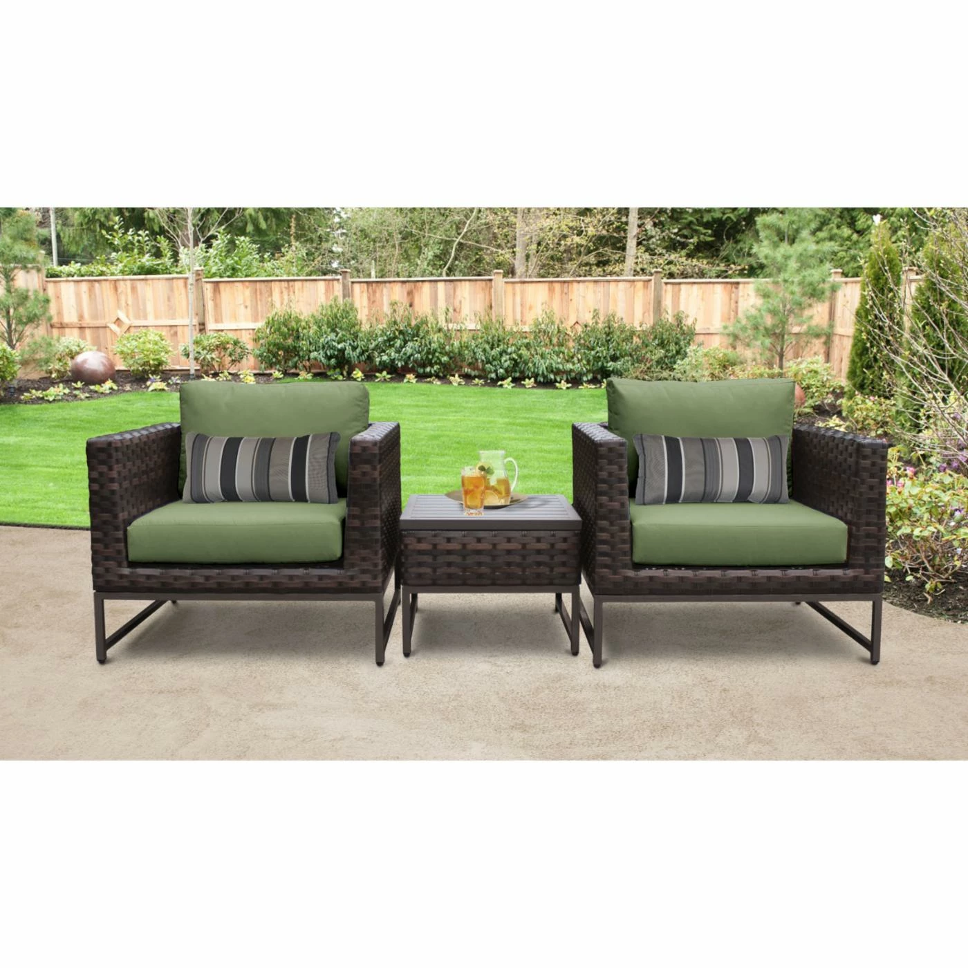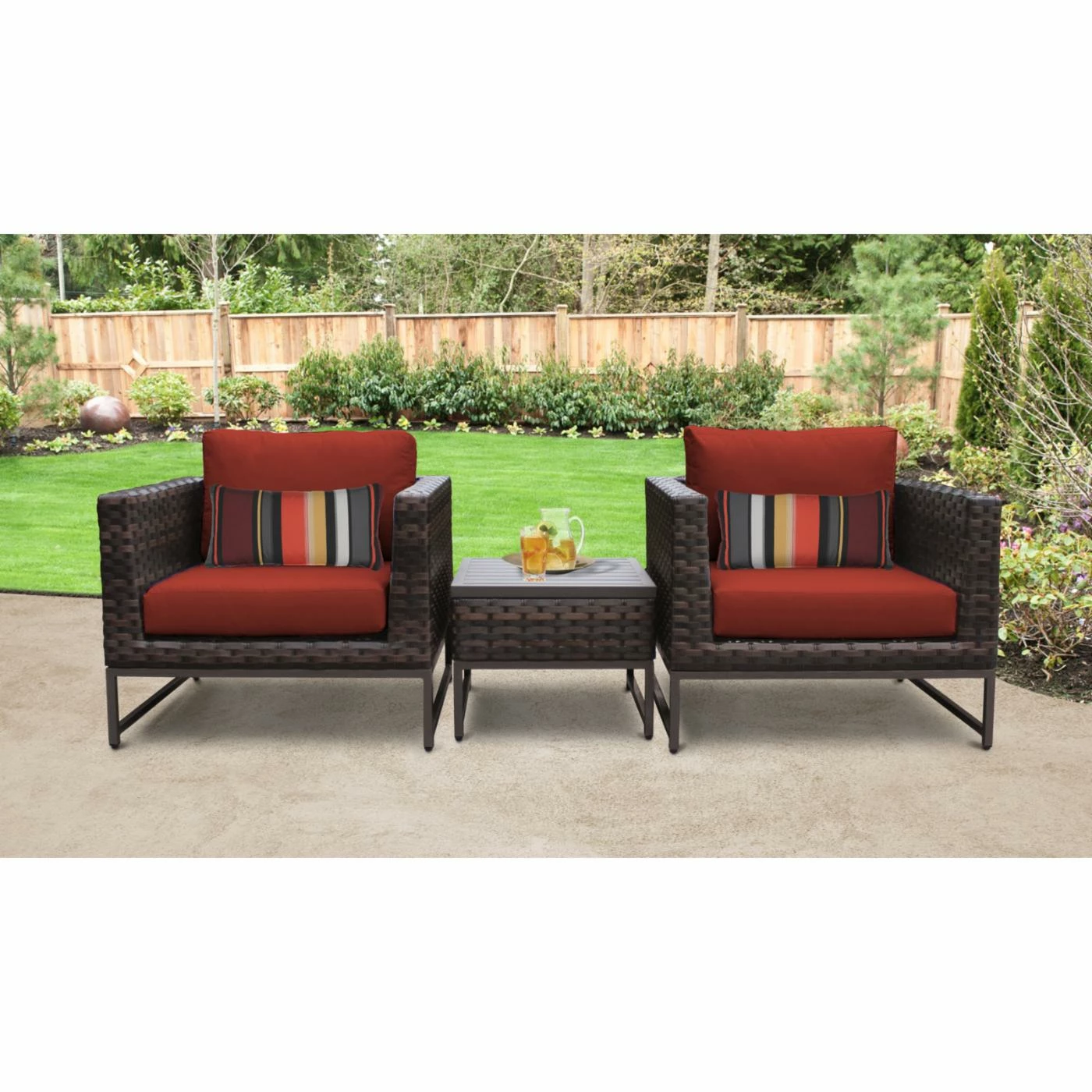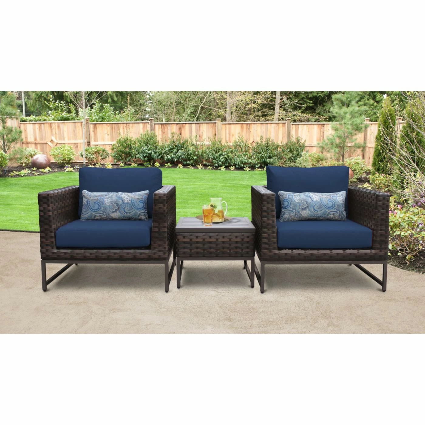 The TK Classics Barcelona Wicker 3 Piece Patio Conversation Set turns an ordinary outdoor space into a lounge area. This set includes two arm chairs and a side table. Each piece is constructed of aluminum with resin wicker wrapped seats. Each chair is topped with yarn-dyed acrylic seat and back cushions. Choose from the available frame finishes and cushion colors to customize the set. Rust-resistant, all-weather materials create durable designs for your patio. Two coordinating throw pillows are included.