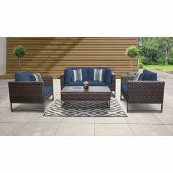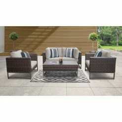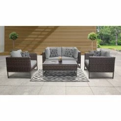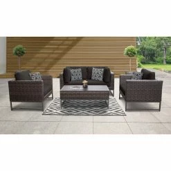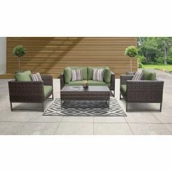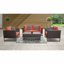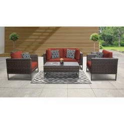 With the TK Classics Barcelona Wicker 5 Piece Sectional Loveseat Patio Conversation Set with Club Chairs on your patio, you won’t want to go inside. This set includes a loveseat, two armchairs, and a coffee table. Each piece is durably constructed for outdoor use. The powder-coated aluminum frames are wrapped with woven resin wicker and topped with yarn-dyed acrylic fabric cushions. Choose from the available cushion colors and frame finishes. For uneven ground, the feet are equipped with levelers. Four throw pillows are included for added comfort.