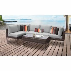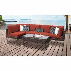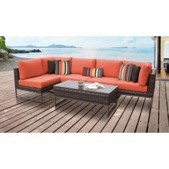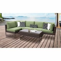 Have a grand outdoor party with your friends and family gathered on the comfortable and stylish TK Classics Barcelona Wicker 6 Piece L-Shaped Patio Conversation Set. This set includes chairs that piece together to create an L-shaped sectional sofa. The durable powder-coated aluminum frames will standup to harsh outdoor weather with their high-density polyethylene wicker in a walnut finish. The base of the frames have height adjusters for uneven surfaces that won’t mar your patio or deck. The aluminum bases come in your choice of available finish. Detachable plush cushions add comfort to the set. These yarn-dyed and acrylic fabric cushions are customizable for a truly unique look. The removable zipper covers come in your choice of available color. The covers are machine washable for your convenience. The included coffee table provides storage space beneath its cast aluminum tabletop for you to organize your outdoor area.