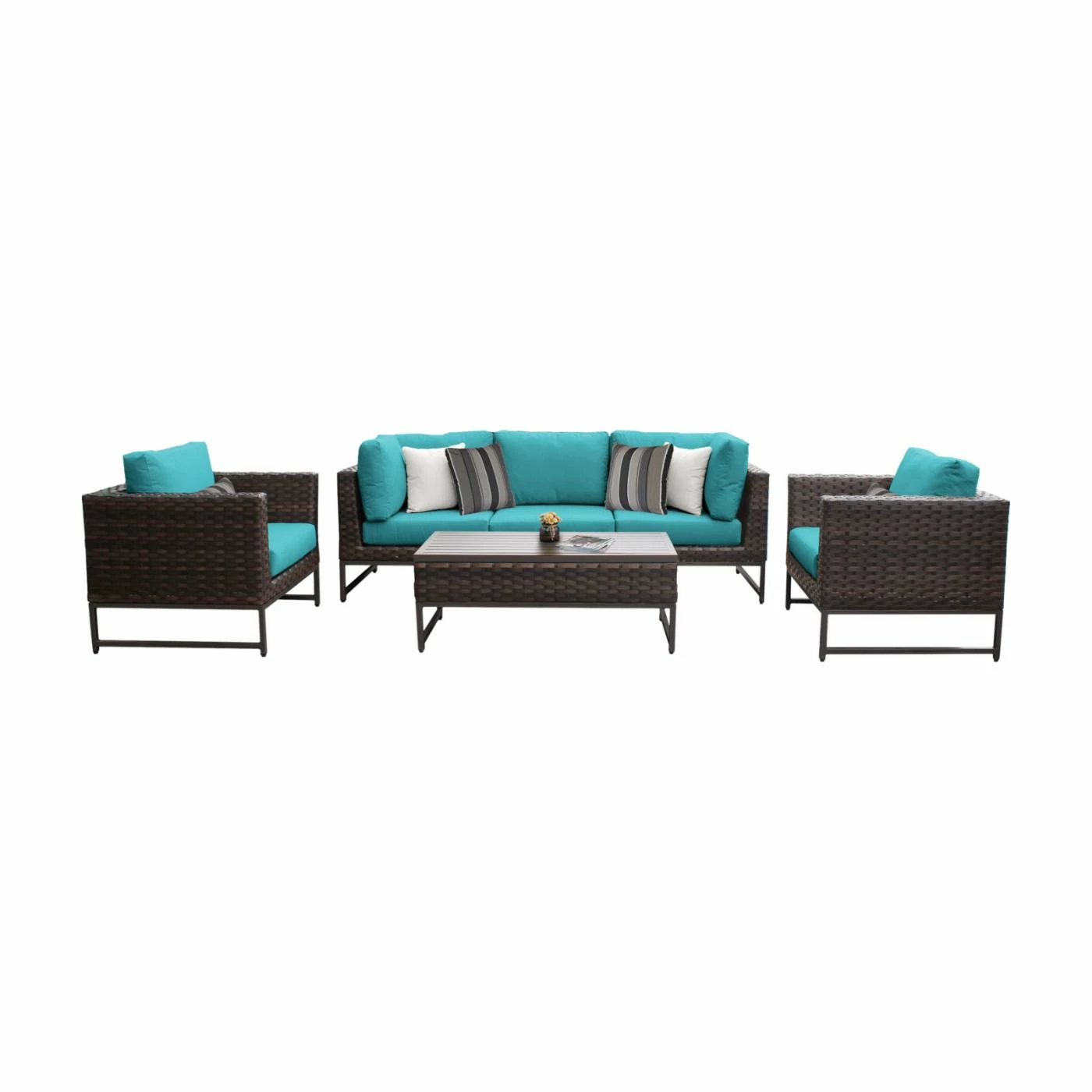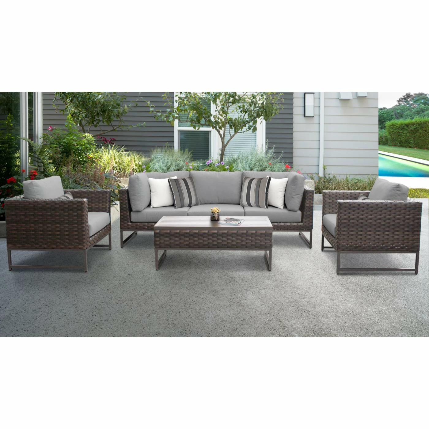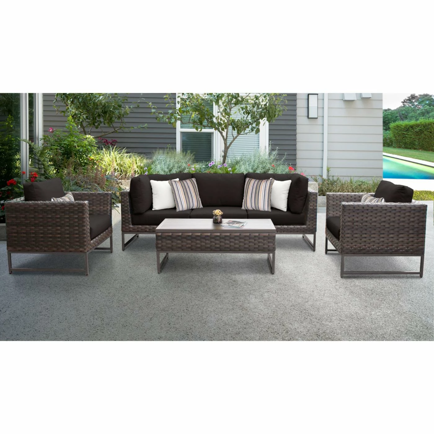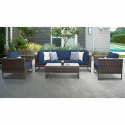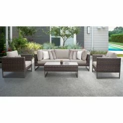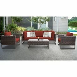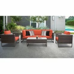 Invite friends over to enjoy a nice evening outside on the comfortable and stylish TK Classics Barcelona Wicker 6 Piece Sectional Sofa Patio Conversation Set. This set includes two arm chairs and a three-seat sofa, all with plush cushions. The durable powder-coated aluminum frames will standup to harsh outdoor weather with their high-density polyethylene wicker in a walnut finish. The base of the frames have height adjusters for uneven surfaces that won’t mar your patio or deck. The aluminum bases come in your choice of available finish. Detachable plush cushions add comfort to the set. These yarn-dyed and acrylic fabric cushions are customizable for a truly unique look. The removable zipper covers come in your choice of available color. The covers are machine washable for your convenience. The included coffee table provides storage space beneath its cast aluminum tabletop for you to organize your outdoor area.