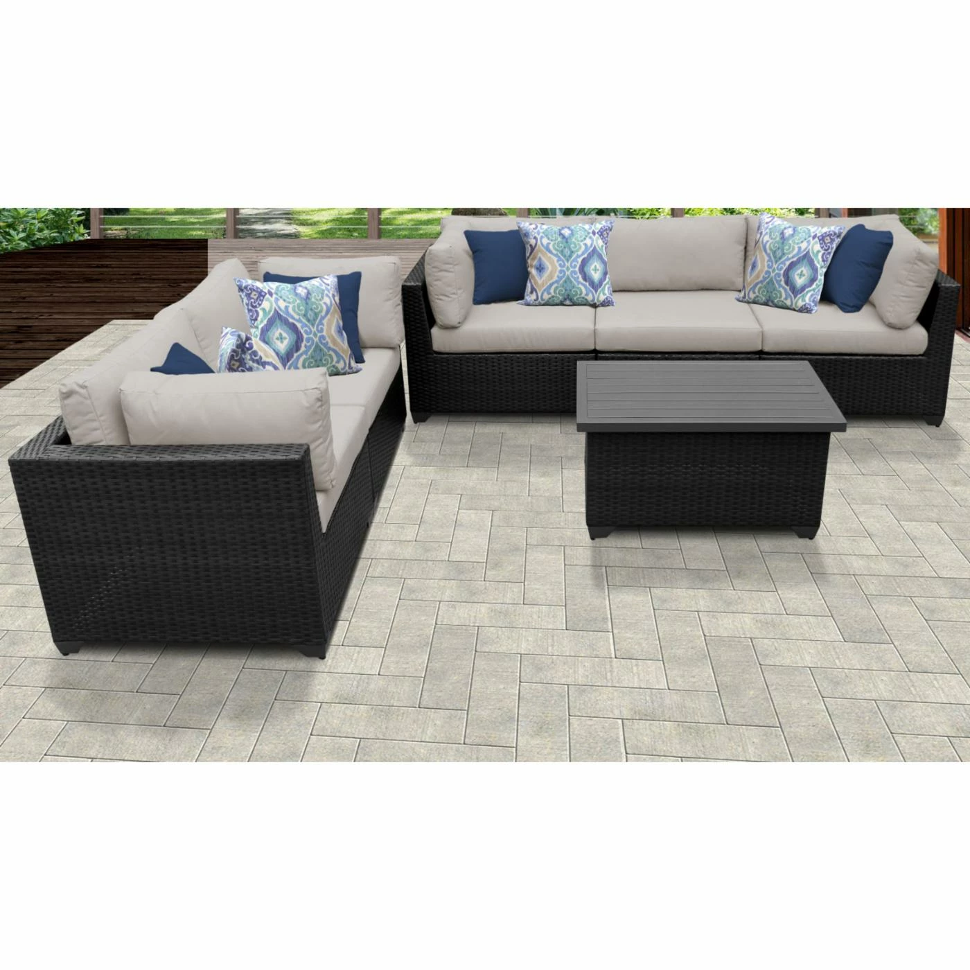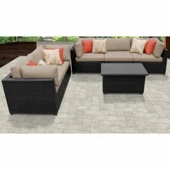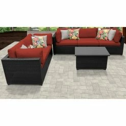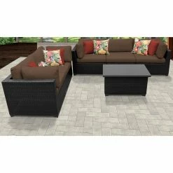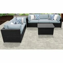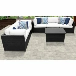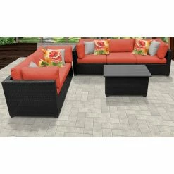 Featuring pieces with angled backs and slim silhouettes, the TK Classics Belle 6-Piece Outdoor Wicker Patio Conversation Set is a small-space solution for a cozy patio setting. This set includes four corner sofas, an armless sofa, and a coffee table, which you can configure exactly to your liking. Each piece is constructed of custom hand-woven, all-weather, high-density polyethylene wicker wrapped over rust-resistant, powder-coated aluminum frames to durably resist the elements. Thick, weather-ready cushions in select colors provide comfort, support, and a decorative touch, and the zippered cushion covers are removable and washable for easy cleaning. Simply let them air dry for best results.