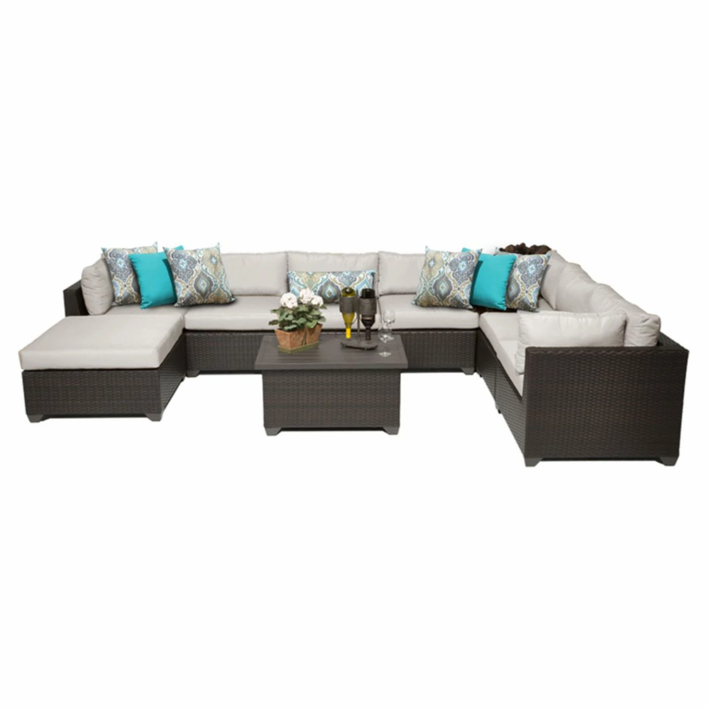 Go to the post office and let your letter carrier know to start delivering the mail to the backyard, because chances are you’ll be spending all of your time on the TK Classics Belle Wicker 9 Piece Patio Conversation Set with Ottoman and 2 Sets of Cushion Covers. This all-weather sectional is designed to deliver a high-end appearance on a full set of versatile, durable pieces. This collection includes three corner chairs, four armless middle chairs, a wide ottoman, and a matching coffee table with a cast aluminum top. The chairs offer deep comfort in the form of wide seats and high, angled backrests. The ottoman is large enough to function as another seat, and it can even turn one of the chairs into a roomy chaise. Thick cushions add a soft contrast to the bold lines of the set. The foam-filled cushions sport welted-fabric covers. Even though resin wicker may look and feel like traditional wicker, it’s made from polyethylene, a synthetic material that offers superior resistance to rot, cracking, and fading. The lightweight, super-strong body is provided by a frame of welded aluminum. This rust-proof material has a powder-coated finish for added corrosion-resistance, and while it’s strong, aluminum is also quite light, making it easy to move around your space.