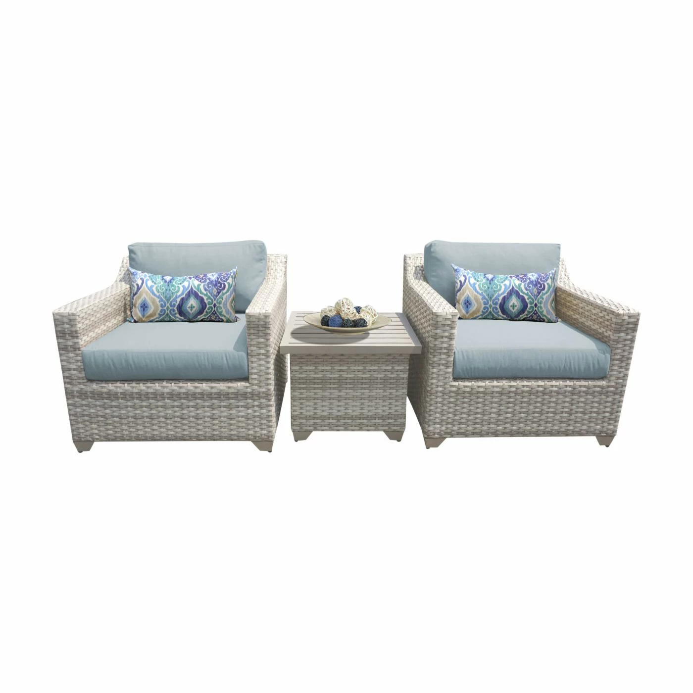 Give your outdoor space a romantic sitting area for two with the TK Classics Fairmont 03A Wicker 3 Piece Chat Set. This two-chair set features a coordinating side table for added convenience. The plush cushions on the top of these chairs come in your choice of available fabric color options.