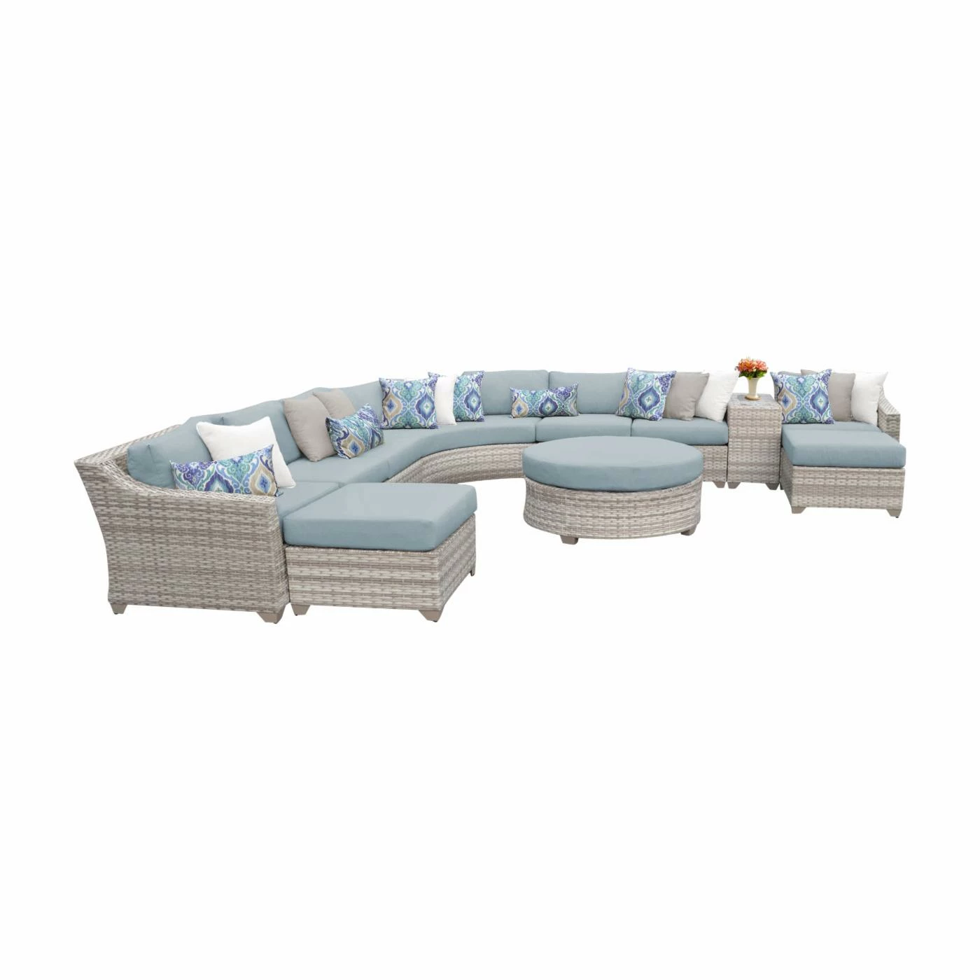 Bring plush comfort and classic style to your outdoor room with the TK Classics Fairmont 11c All-Weather Wicker 11 Piece Conversation Set. This conversation set is crafted with all-weather wicker that will resist fading, cracking, and splintering. It is finished in a neutral vanilla cream, and hand woven around sturdy, powder coated aluminum frames. Coordinating seat and back cushions provide six inches of lofty comfort. One set of cushions comes in a natural beige color and an additional set comes in your choice of available colors to coordinate with your outdoor dΓ©cor. This modular set offers multiple configurations and ample seating. The cup table is finished in all wicker and provides an ideal place to serve drinks or snacks. The round coffee table is topped with a coordinating cushion. Two ottomans offer lounging space, additional seating, or serving space. Prevent tipping and rocking on uneven patios, porches or decks with the adjustable feet levelers. The zippered cushion covers are easy to remove for cleaning and should be air dried. Savor sunny weather and ideal conversation on this enticing conversation set.