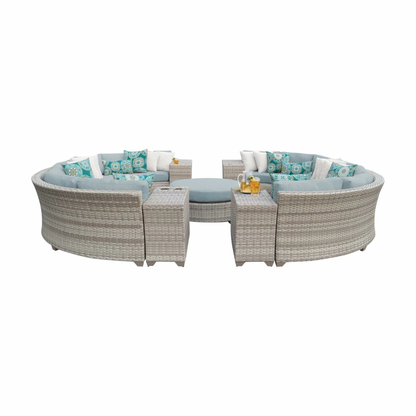 Enjoy fresh air and good company with the TK Classics Fairmont 11b All-Weather Wicker 11 Piece Conversation Set. Linger on the exquisitely comfortable, six inch seat and back cushions. You Choose from available cushion colors of cushion covers to coordinate with your dΓ©cor. Sturdy, all-weather, synthetic wicker resists fading and splintering. A vanilla creme finish complements a variety of decorating styles. A powder-coated aluminum frame provides durability and resists rust. Prevent tipping and tilting on uneven patio or deck surfaces with the feet levelers. This modular set provides a multitude of options for the ideal configuration. A circular ottoman doubles as a table or additional seating. Serve drinks and snacks on the four convenient all wicker, cup tables. Promote conversation with the charming, rounded sofas. Bring luxurious comfort and classic style to your outdoor room with this inviting conversation set. Zippered cushion covers remove easily for washing.