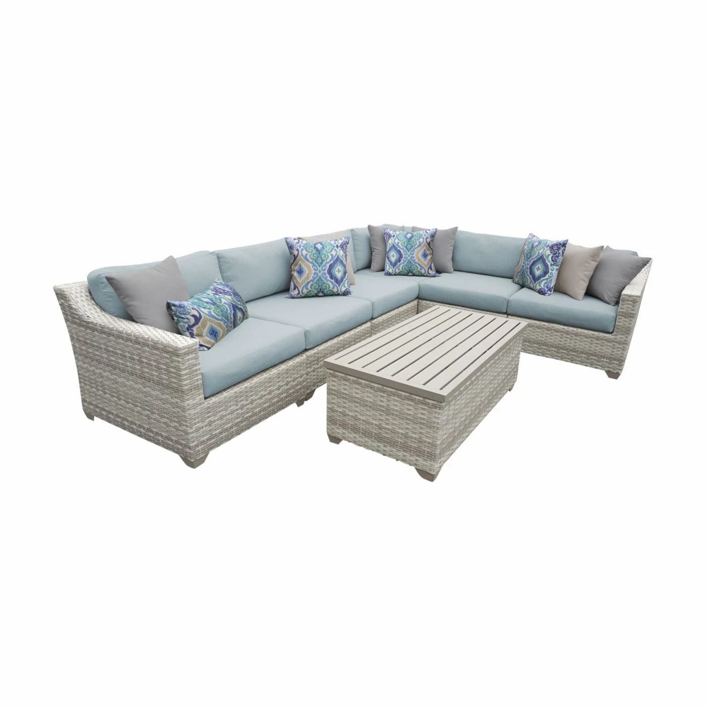 The TK Classics Fairmont 07b All-Weather Wicker 7 Piece Conversation Set makes a perfect place to gather friends and family by the poolside or on the porch. This modular set of patio furniture contains six seats and a rectangular coffee table. Each piece is built with the same powder-coated aluminum that prevents rusting, warping, and rotting. A slatted top accents the table. Weather-resistant wicker forms protective shells around the base on each piece. For comfort, each seat is outfitted with foam-padded all-weather cushions. The cushion covers are machine-washable for easy care. Choose your preferred color option from the available.
