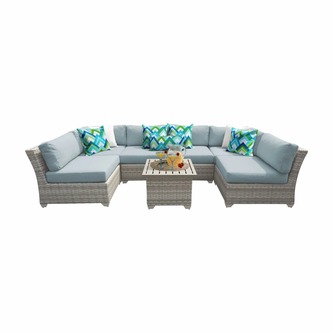 Whether as a single unit or scattered, the TK Classics Fairmont 07c All-Weather Wicker 7 Piece Conversation Set is an enduring set of seats that provide comfort and coziness for your outdoor location. Four armless sofa seats and two corner seats are included in this set along with a square, slatted-top coffee table for food and drinks. Solid, lightweight aluminum constructs the frames, which are topped by a powder-coated finish that prevents rust and resists fading. Six-inch thick seat and back cushions are included, each wrapped in a removable, machine-washable cover woven from water-proof, quick-dry fabric. Dense wicker shells encase the frames. Choose from available color options.