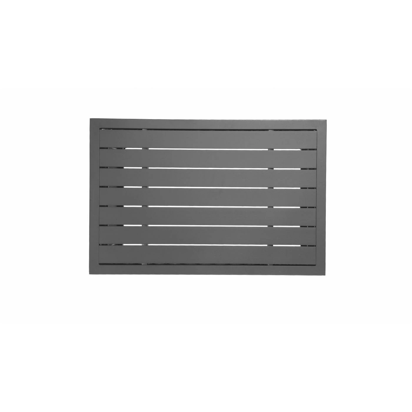 - Tables feature slatted cast aluminum tops with powder-coat finish