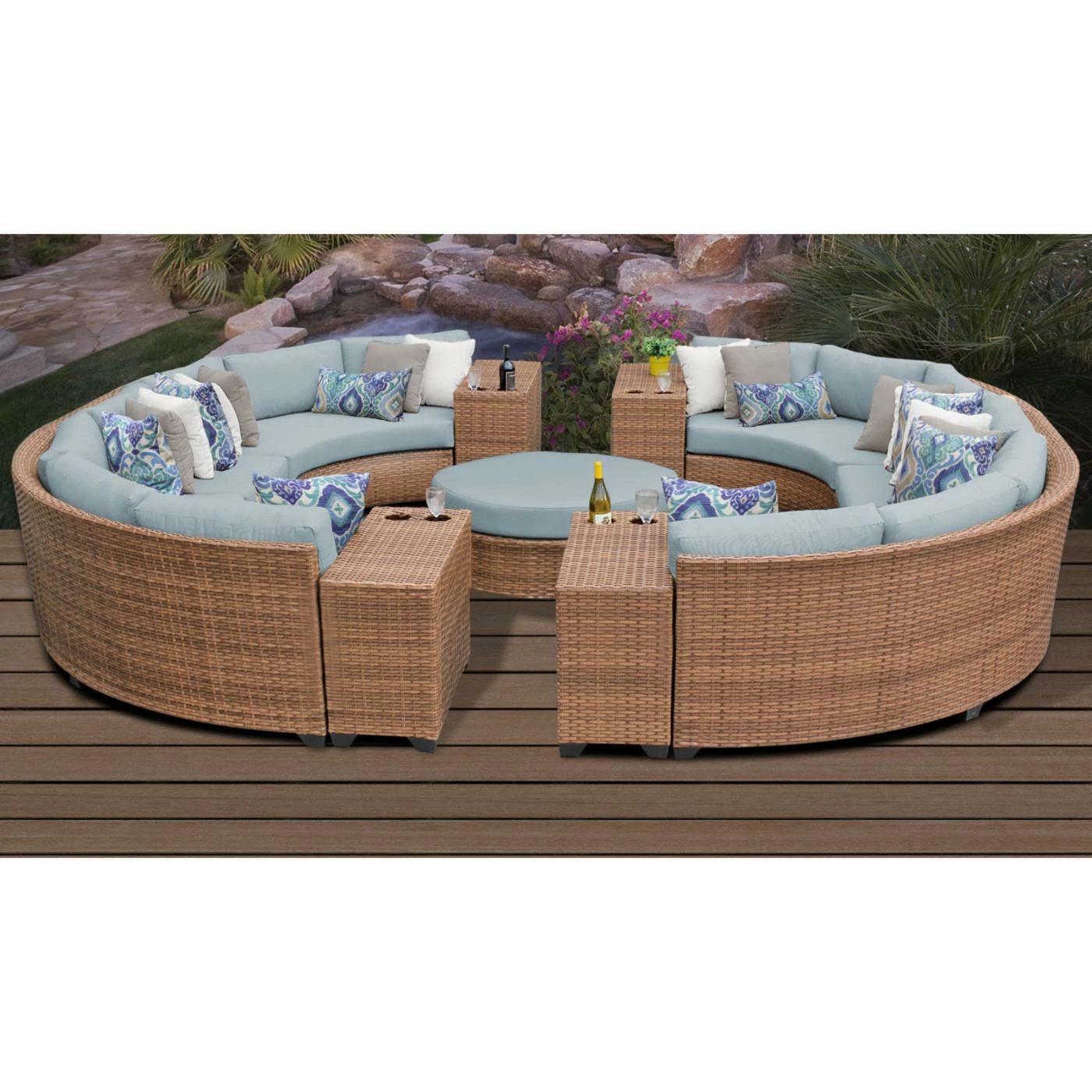 Just when you thought that great weather couldn’t get any better, along comes the TK Classics Laguna Wicker 11 Piece Conversation Set with Cup Table and 2 Sets of Cushion Covers. With its inviting circular footprint, this patio conversation set includes four curved armless sections, two armless sections, four cup tables, and a round coffee table with a cushion. And this set is built tough thanks to rust-resistant powder-coated aluminum frames that are hand woven with all-weather high-density polyethylene wicker in a rich caramel color. And you’ll also get two sets of cushion covers. The zippered covers are crafted of acrylic that’s fade resistant and washable for easy care.