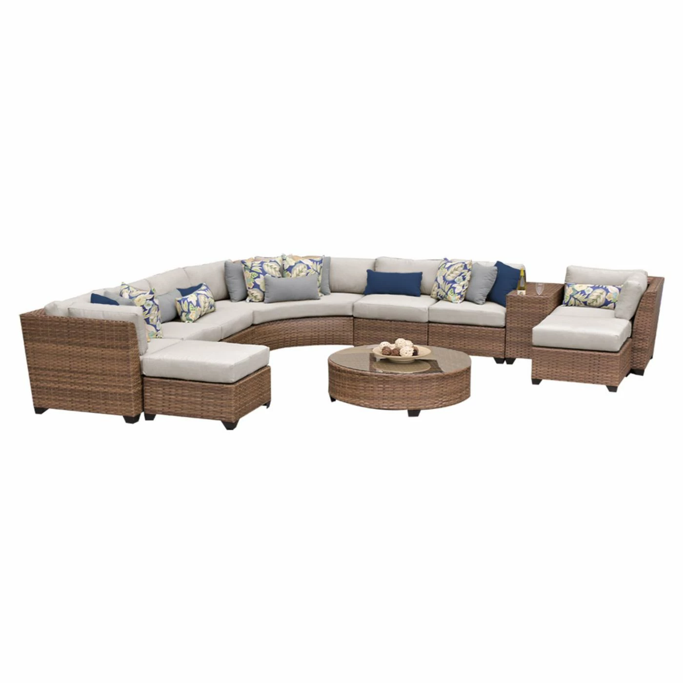 The TK Classics Laguna Wicker 11 Piece Patio Conversation Set with Ottoman and 2 Sets of Cushion Covers will give you 11 reasons to spend more time outside this summer – and you’re sure to discover more. Four armless sections, a curved armless section, and two corner sections form the sofa sectional, and this conversation set also includes two ottomans, a cup table, and a round coffee table with a cushion. Each piece is crafted of rust-resistant powder-coasted aluminum frames hand woven with all-weather high-density polyethylene wicker in a caramel color. You’ll also receive two sets of zippered cushion covers. Cushions are crafted of fade-resistant, washable acrylic.