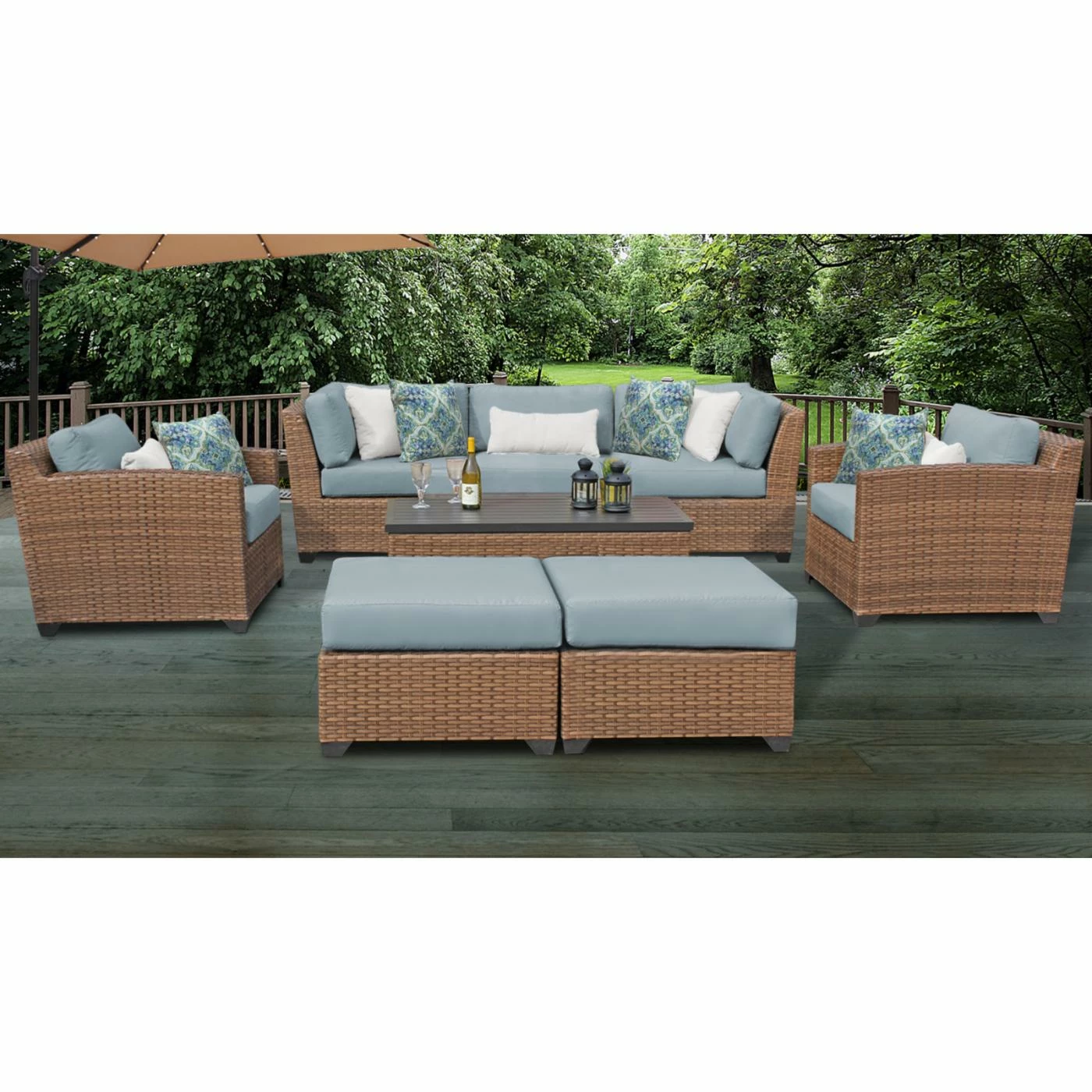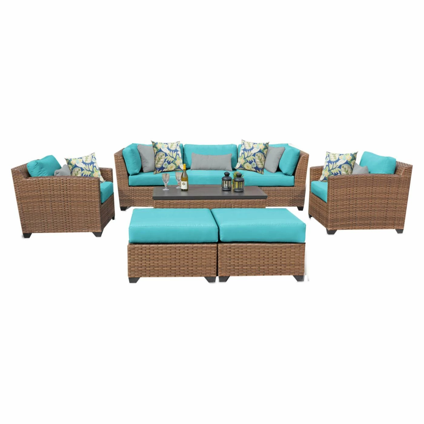 Get serious about outdoor fun this summer with the TK Classics Laguna Wicker 8 Piece Patio Conversation Set with Ottoman and 2 Sets of Cushion Covers. Creating a welcoming gathering spot for family and friends, this conversation set includes two corner sections and an armless section to form a sofa, plus two club chairs, two ottomans, and a coffee table with a cast aluminum top that flips up to reveal a handy storage space. With a commercial-grade durability, each piece features a rust-resistant powder-coated aluminum frame hand woven with all-weather high-density polyethylene wicker in caramel. And not only are the acrylic cushion covers washable and fade resistant, but you’ll get two sets of them – all with easy-on/off zippered designs. Conversation set includes one set of of wheat covers and your choice from available cushion colors for second set.