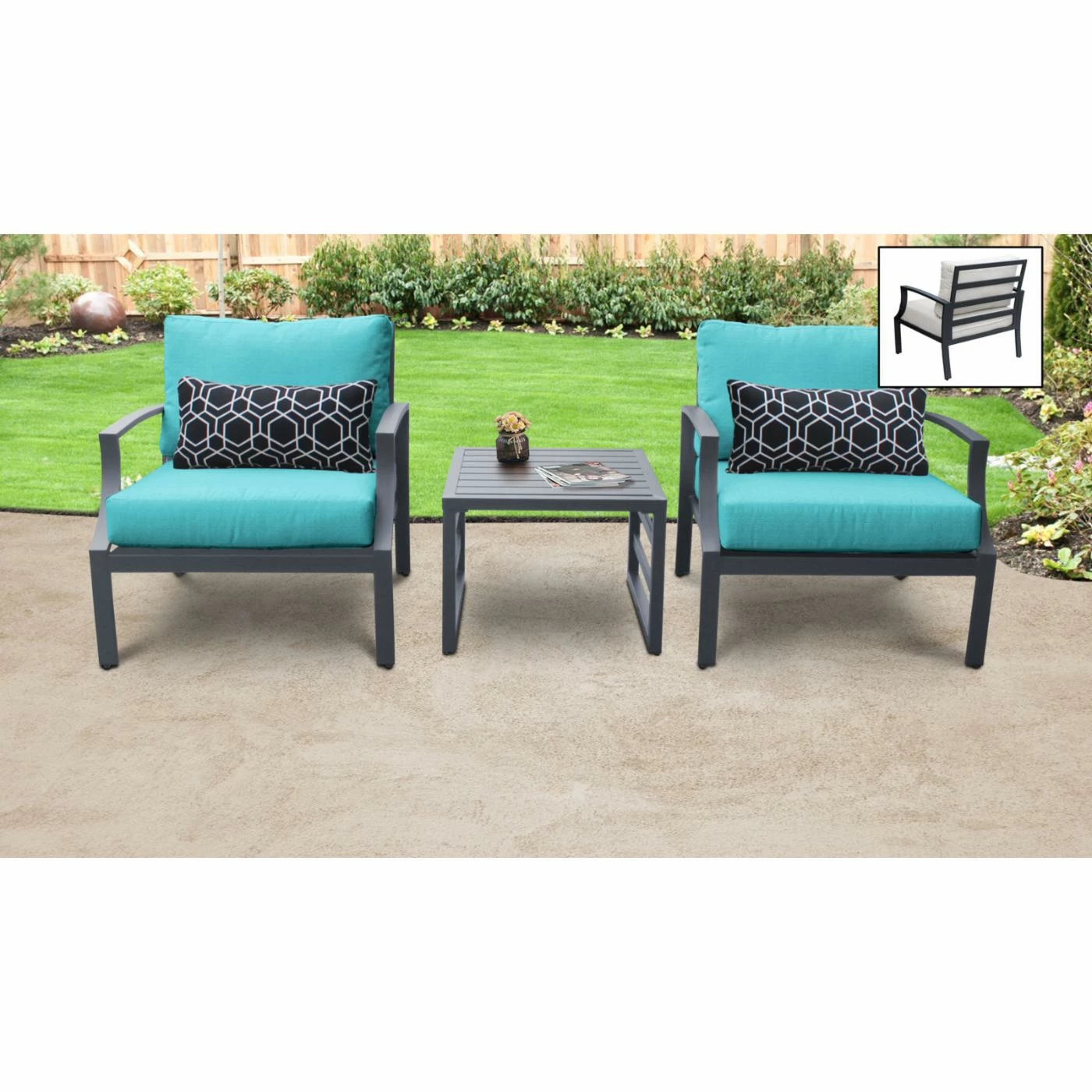 The TK Classics Lexington 03a 3 Piece Aluminum Outdoor Patio Conversation Set is built tough enough for commercial uses – which makes it just right for your home all year long. This intimate chat set includes two arm chairs with an end table that’s perfect for resting in between and holding refreshments and snacks. The three-piece set starts with powder-coated aluminum frames which resist rust. The chairs are then paired with acrylic cushions; their covers are removable for easy care and maintenance. On the feet, levelers protect against scratches while adjusting height for uneven surfaces.