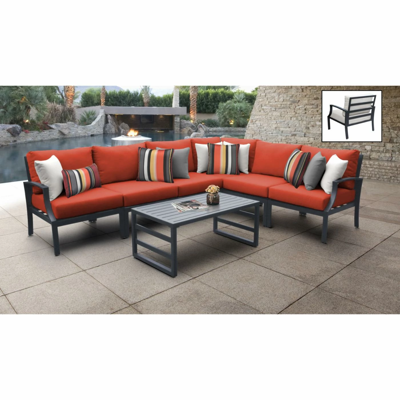 Built tough, the TK Classics Lexington 07b 7 Piece Aluminum Outdoor Patio Conversation Set is equally suitable for commercial or residential use. This set starts with rust-resistant aluminum frames which are powder coated to protect against weather damage. On top of the frames rest plump cushions, made with yarn-dyed acrylic upholstery in a range of vibrant color options. The cushion covers are easily removable, so you can spot clean them at your leisure.