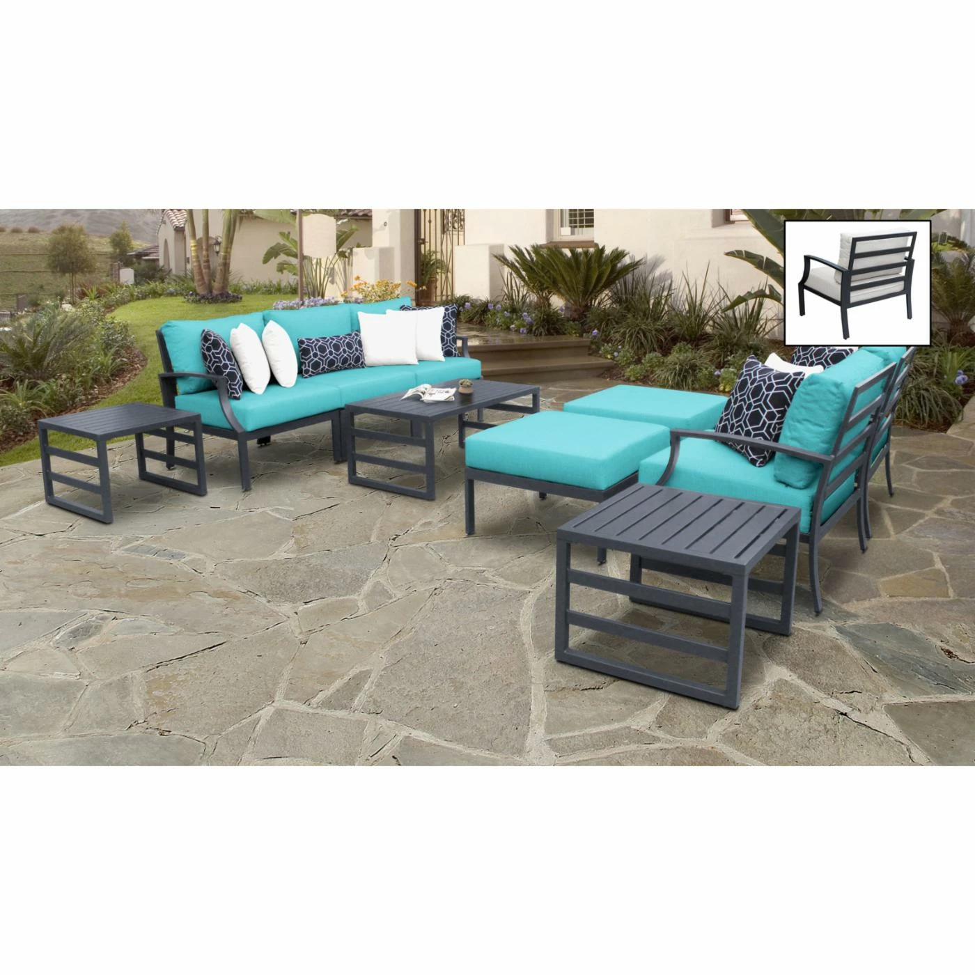 Use the TK Classics Lexington 10c 10 Piece Aluminum Outdoor Patio Conversation Set to create an open gathering area where conversations flow. This modular outdoor set provides seating for five people (seven people if you use the ottomans as stools) with two club chairs, two end chairs, and one armless middle chair. It also has two side tables and a coffee table so you can keep your guests well stocked with drinks and snacks all night long.