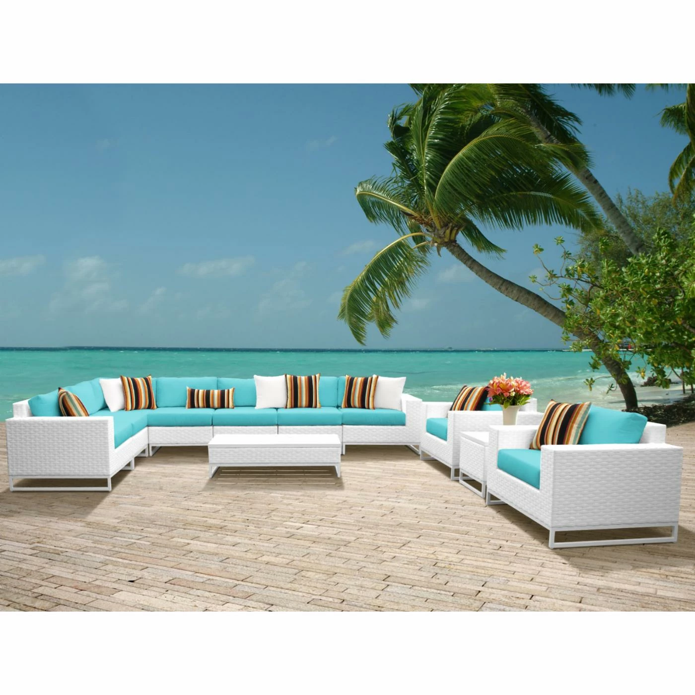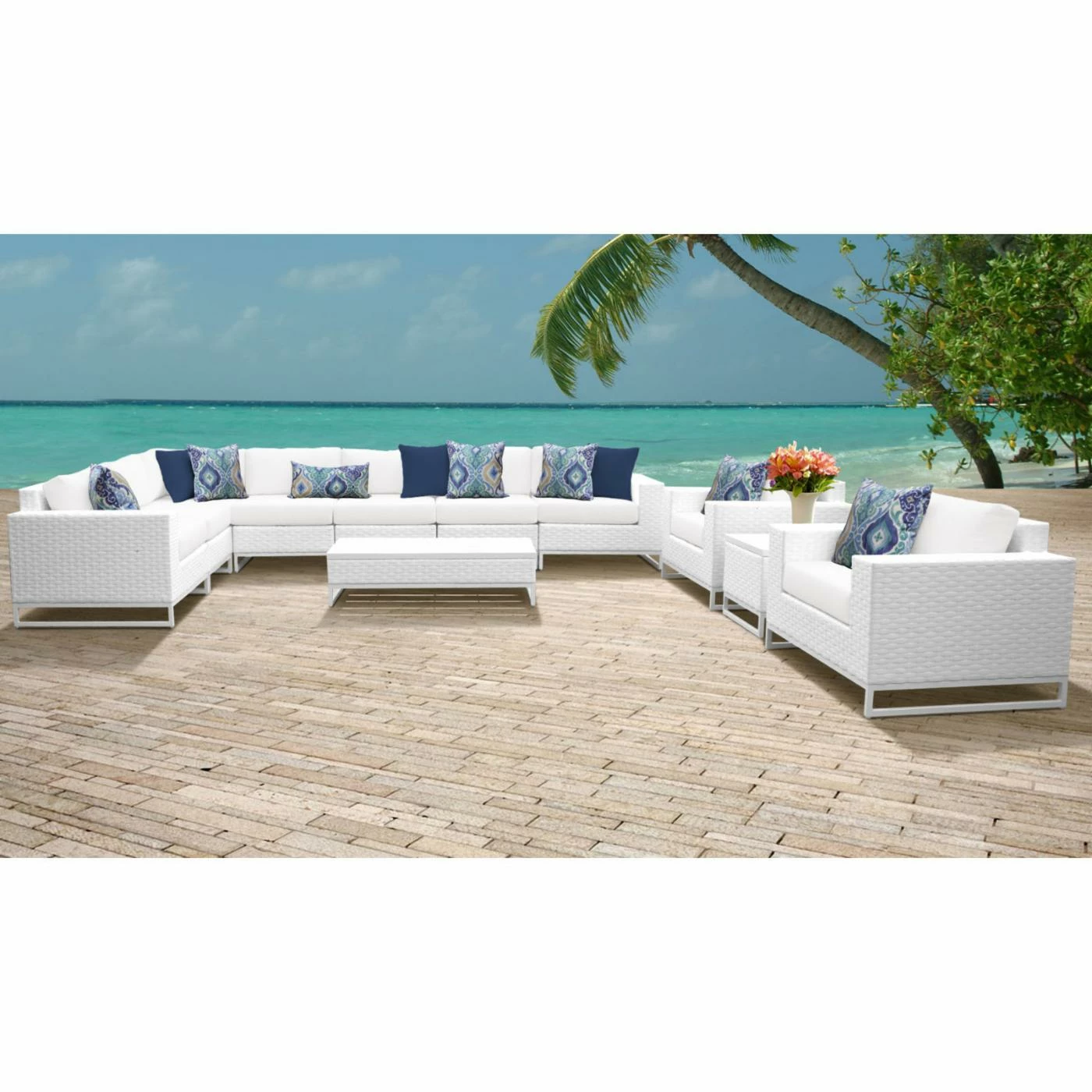 The TK Classics Miami Wicker 11 Piece Patio Conversation Set is a complete set that can transform a patio or poolside into an oasis worthy of a South Beach nightclub or exclusive, beachfront resort. A bold, angular style gives this set a contemporary feel, but a mix of classic textures and your choice of vivid colors adds an accessible, inviting appearance. This set includes two club chairs, four armless sofas, a corner sofa, left- and right-armed sofas, a coffee table, and a matching end table. Each piece has an internal frame of powder-coated aluminum that’s covered with woven resin wicker in a crisp shade of white. The wicker also covers the matching coffee and end table, but wide tops of cast-aluminum with a slat-style construction gives you practical, low-maintenance surfaces. To complement the white resin wicker, you’ve got a full range of color options for the all-weather fabric cushion covers. Each cushion is filled with a dense slab of foam, and the zippered covers are easy to pull off so you can throw them in the washing machine. Each piece features adjustable foot-levelers that allow you to get a stable footing on any surface. The rust-proof aluminum frames and moisture-resistant resin wicker make this set ideal for outdoor use in any climate.