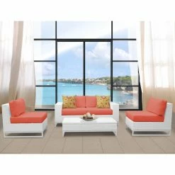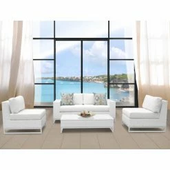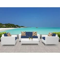 The TK Classics Miami Wicker 5 Piece Patio Conversation Set with Coffee Table is a full set that gives you the ability to customize and transform your outdoor space. This set includes left-armed and right-armed sofas with two club chairs. The matching table has a low form that makes it an easy, central piece for your newly minted outdoor oasis. Each piece in this set shows off an exterior of woven resin wicker in a crisp shade of white. The bold, angular form is created by an internal frame of powder-coated aluminum. You can customize the style of this set by choosing your favorite color for those thick, foam-filled cushions. Each piece has adjustable foot levelers to prevent wobbling. The zippered cushion covers are easy to remove for machine-washing.