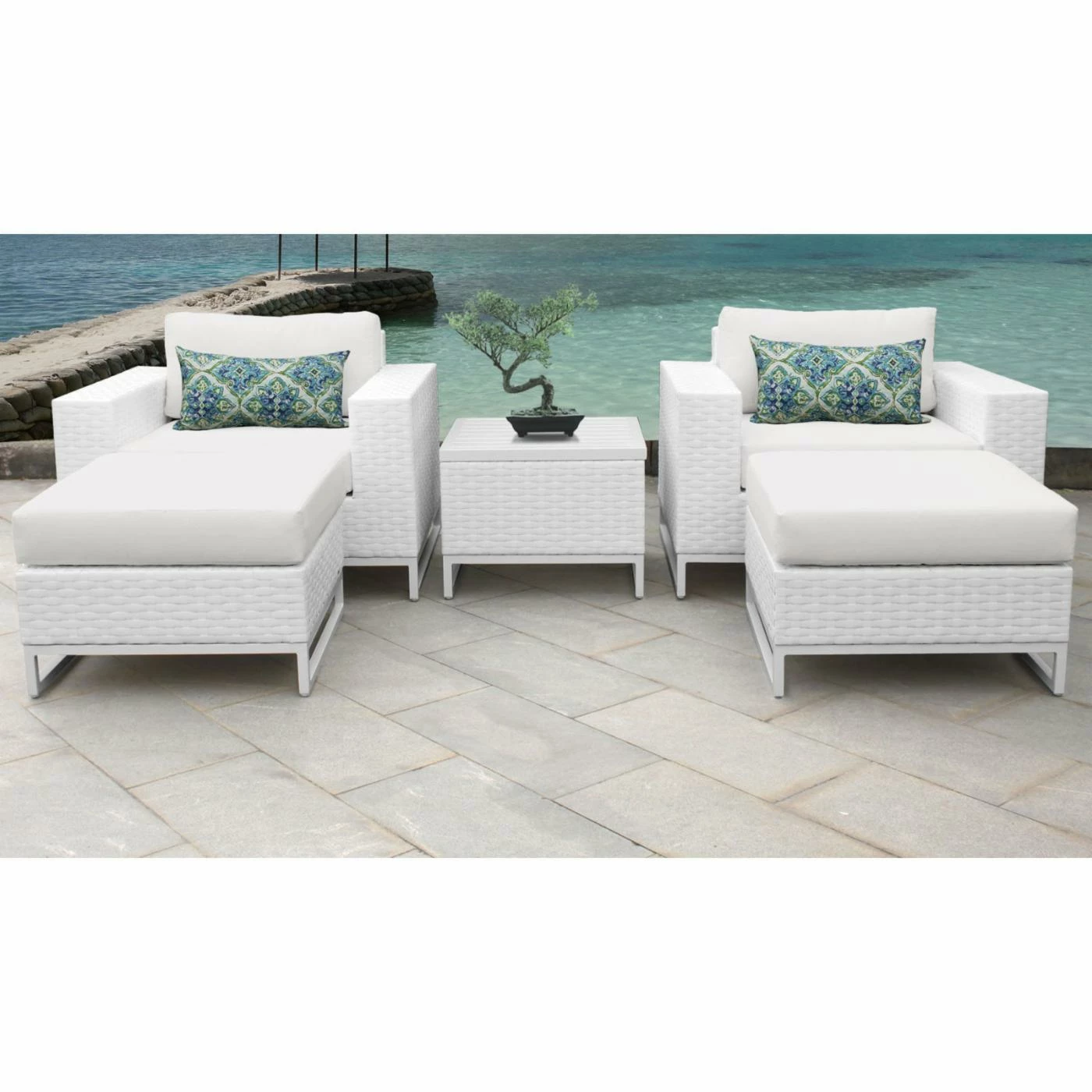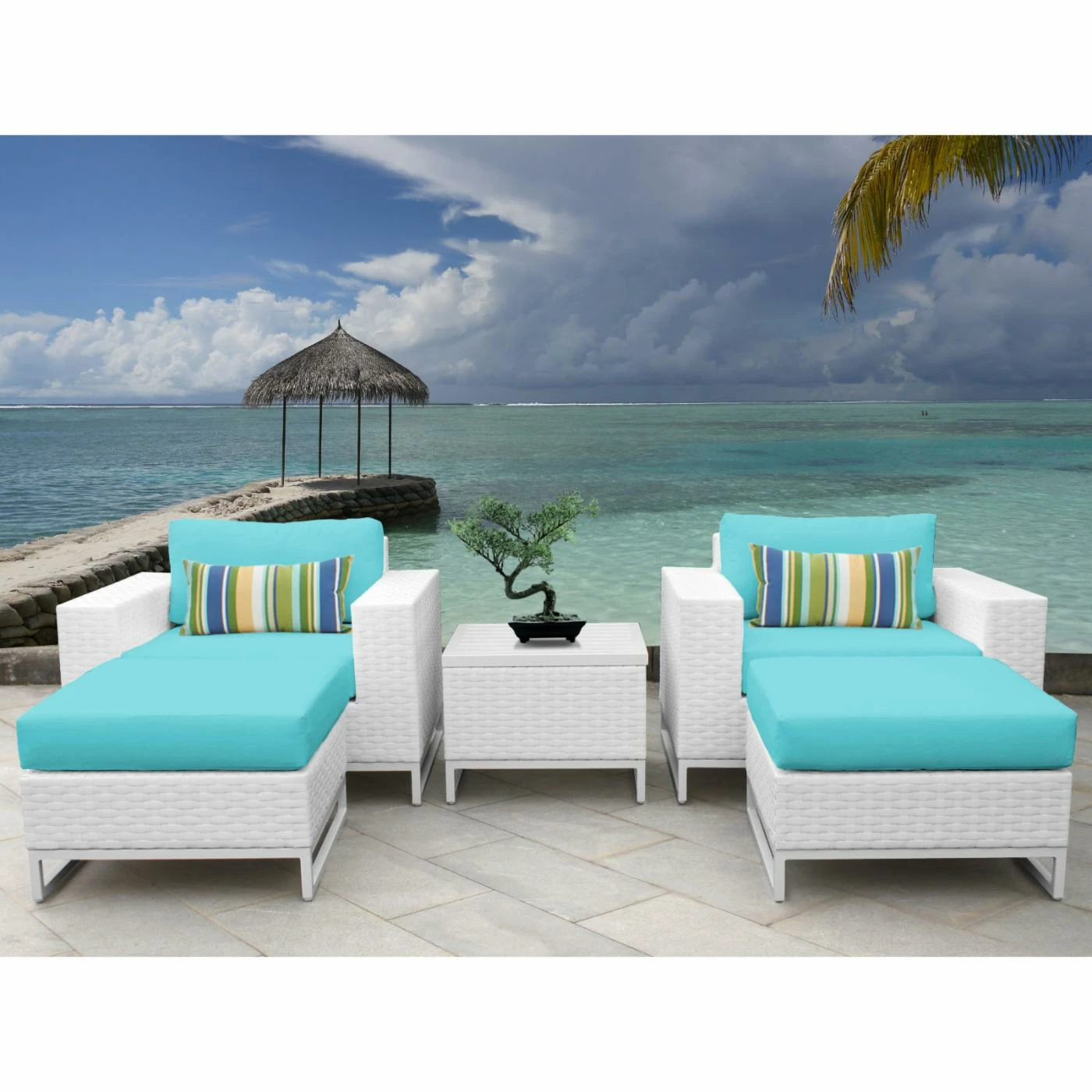The TK Classics Miami Wicker 5 Piece Patio Conversation Set is a one-click move that’s going to seriously upgrade your outdoor-style game. This set includes a pair of club chairs with matching ottomans, and an end table. Each chair shows off deep, cushioned seating inside a body with strong, squared lines. The internal frame of each piece is made from powder-coated aluminum that’s covered with woven resin wicker. This synthetic material has a crisp, white finish, and because it’s made from synthetic materials, it’s not going to fade, rot, or crack while it lives outdoors. The cushions on the seats, backrests, and ottomans are all made from thick slabs of foam inside all-weather covers. The zippered covers are easy to remove for cleaning. The matching table has a top of cast-aluminum with a slat-style texture and a white finish of baked-on powder-coat. Each of the chairs and ottomans have adjustable feet levelers that protect your surfaces while ensuring a stable, wobble-free base in any location.