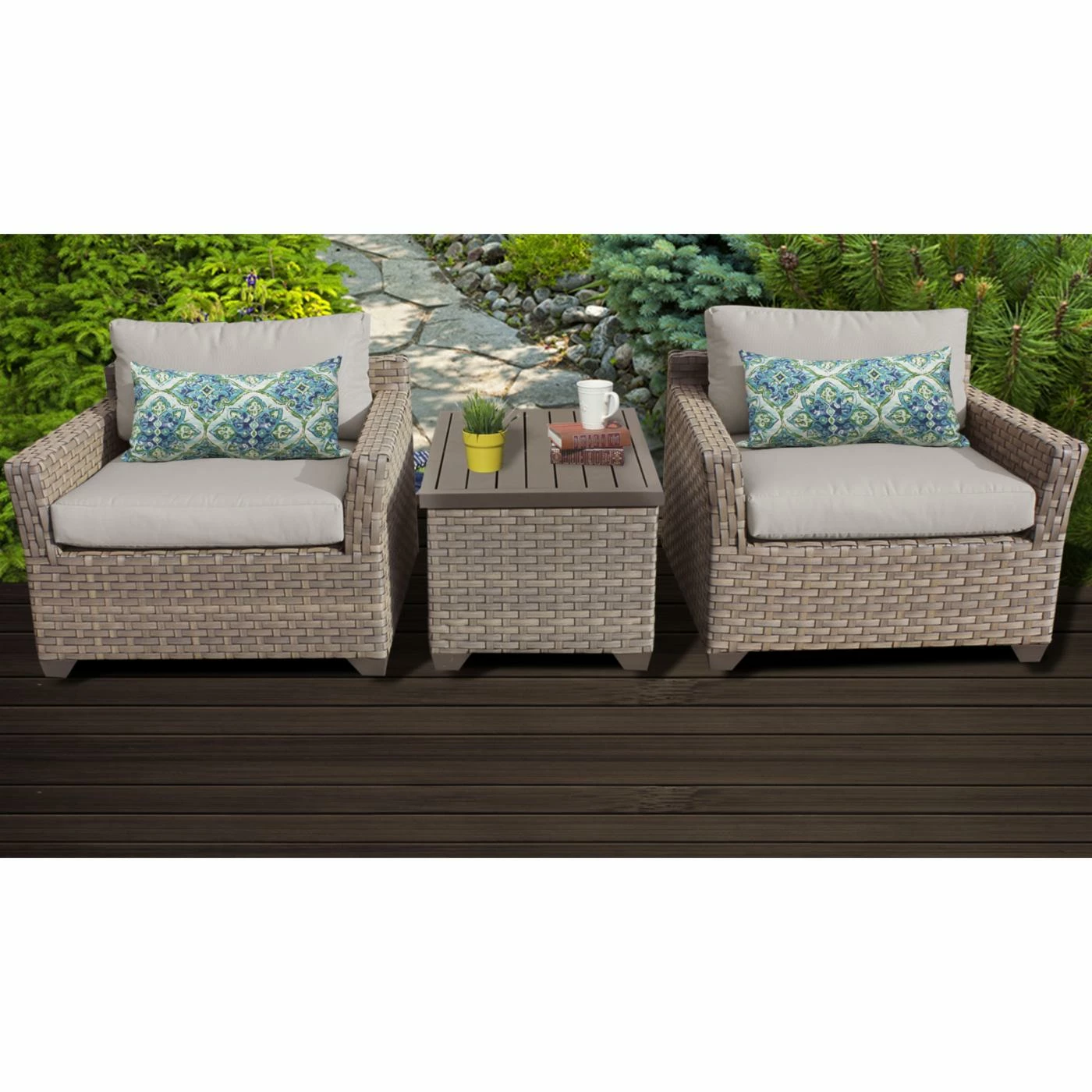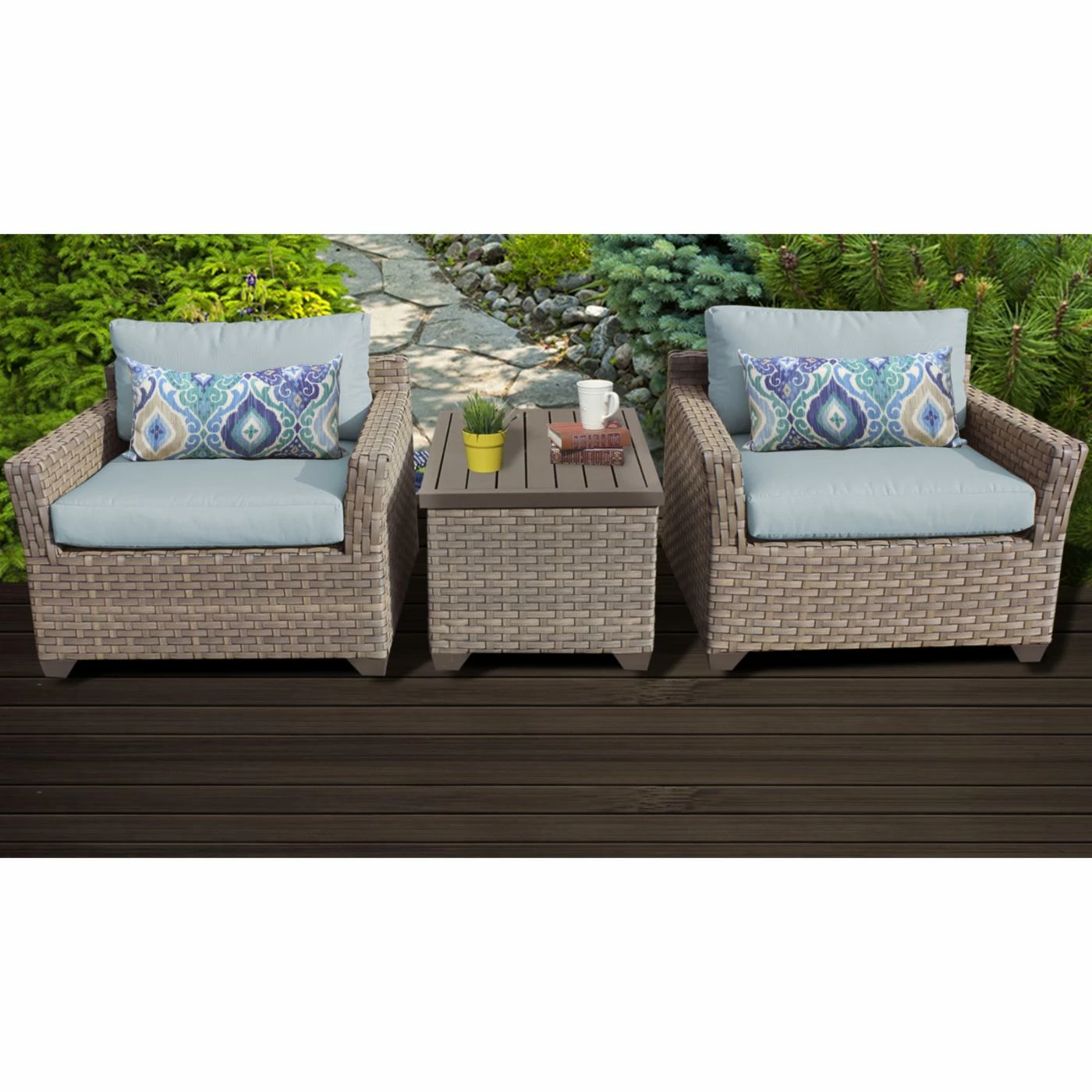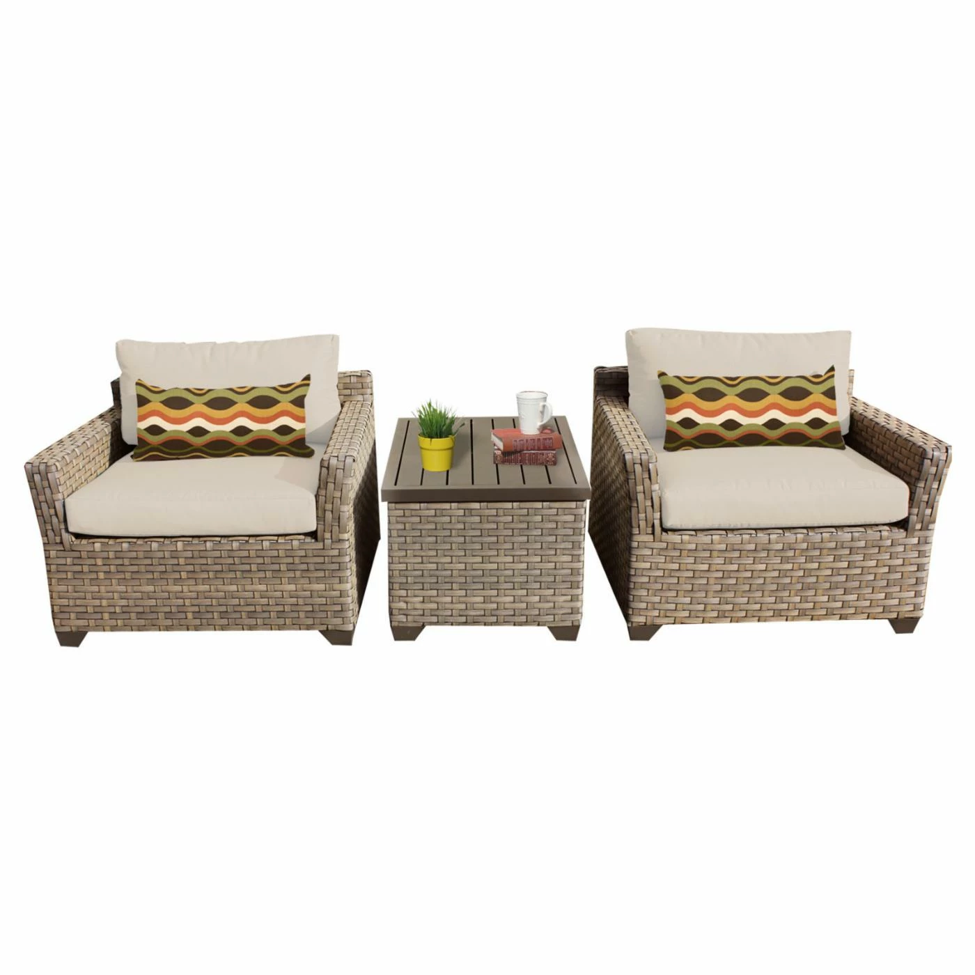 Enjoy nature from the comfort of the TK Classics Monterey Wicker 3 Piece Patio Conversation Set with 2 Sets of Cushion Covers. This nautical ensemble is expertly crafted from rust-resistant aluminum wrapped in hand-woven resin wicker. The wicker is incredibly resilient in all weather conditions and comes in a beautiful Summer Fog finish that will never fade in the sun. The set includes a pair of armchairs with seat and back cushions, plus a rectangular coffee table with lift-top that opens to reveal ample storage for pool gear, reading material, gardening supplies, and all other outdoor essentials. Each piece includes height-adjustable leg levelers for setup on uneven surfaces and cushions ship with two sets of covers, one in beige and one the available color of your choice.