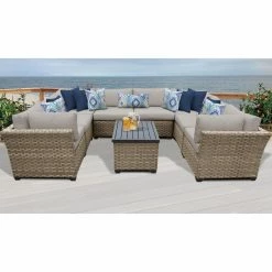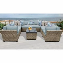 No matter how far you live from the shore, you can give your backyard a cool, coastal vibe with the TK Classics Monterey Wicker 9 Piece Patio Conversation Set with Coffee Table and 2 Sets of Cushion Covers. This relaxing ensemble is expertly crafted from commercial-grade, all-weather materials starting with a durable, rust-resistant aluminum frame and ending in hand-woven resin wicker in a romantic Sea Fog finish. Youโll love playing exterior designer as you shift the generously padded eight-piece sofa to make up your own distinct patio configurations. All furnishings in this set come with plump cushions and two sets of removable covers, one in beige and the second in a color of your choice. This patio group also includes a coffee table with lift-up cast aluminum tabletop that reveals a generous storage compartment perfect for gardening, pool, or entertainment essentials.