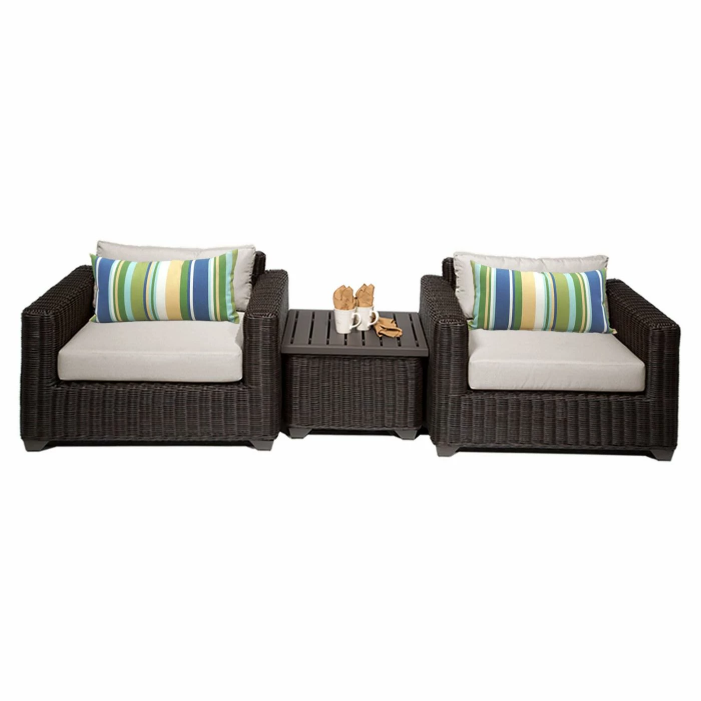 Encouraging a lazy Sunday afternoon, the TK Classics Venice Wicker 3 Piece Patio Conversation Set with 2 Sets of Cushion Covers includes pieces that will give any outdoor setting a sense of inviting luxury. This set comes with a convenient end table and two extra-large club chairs with gently angled backs and curved arms, plus six-inch thick cushions. Each chair is crafted from a rust-resistant aluminum frame concealed by hand woven all-weather resin wicker in a warm chestnut brown finish. Accompanying cushions are shipped with wheat covers and a second set of covers in your choice of color.