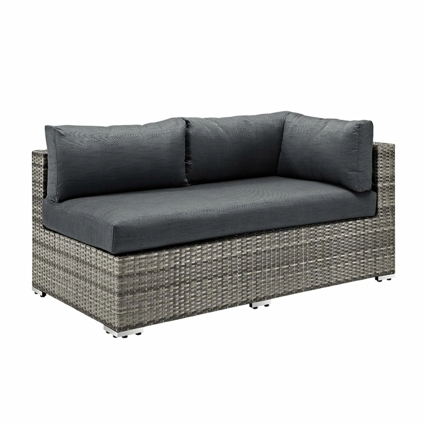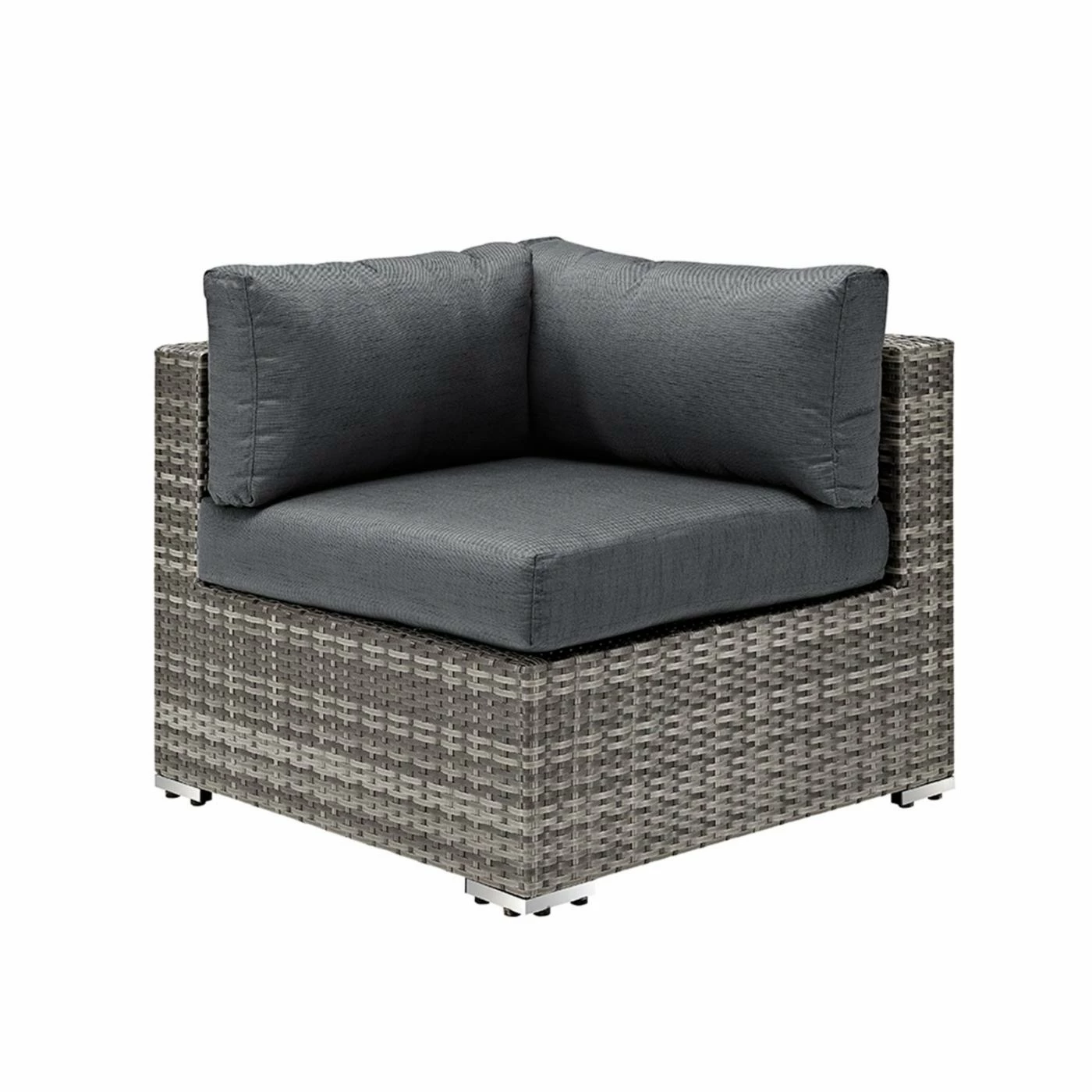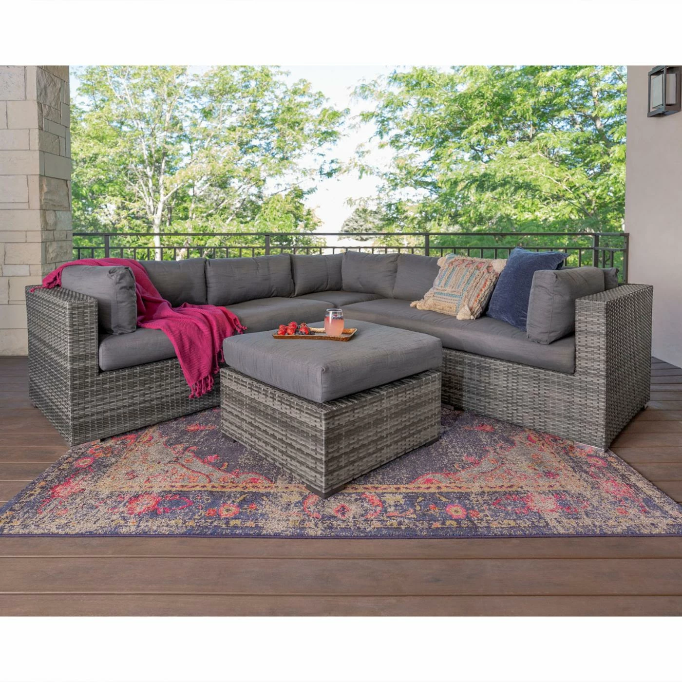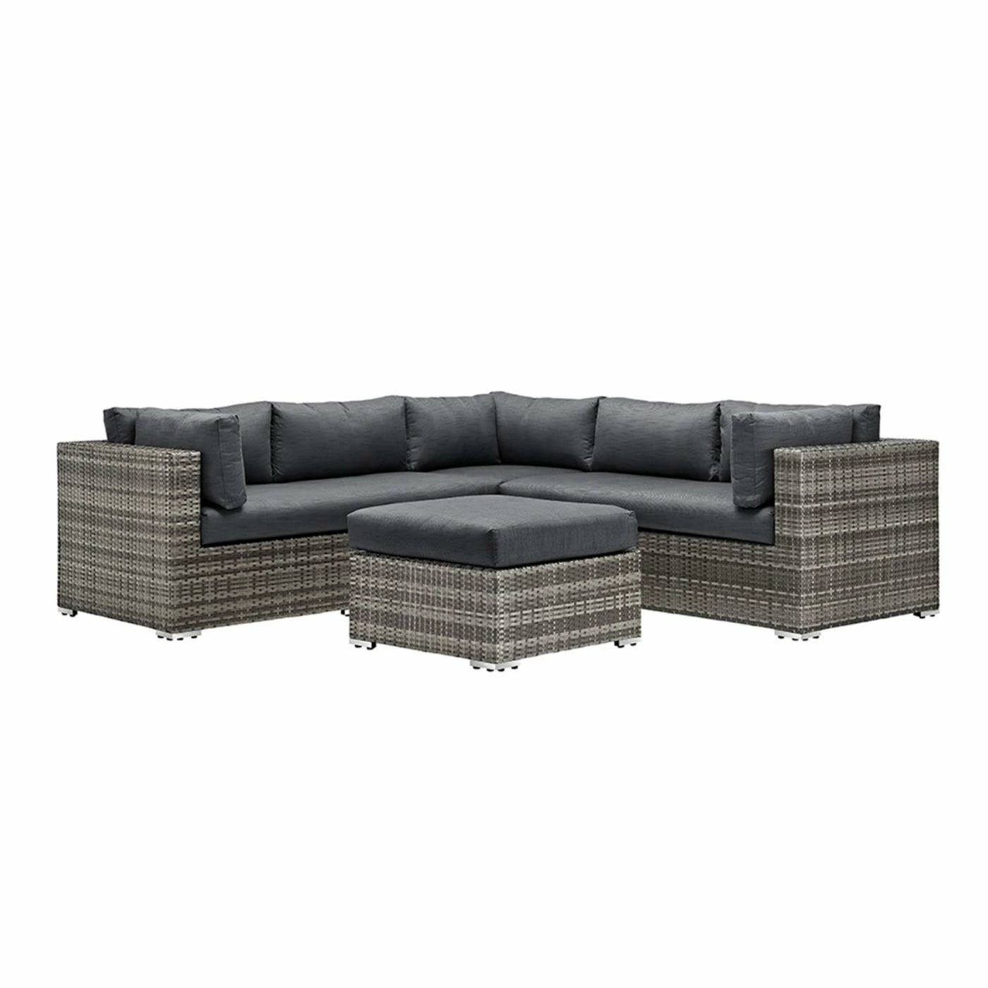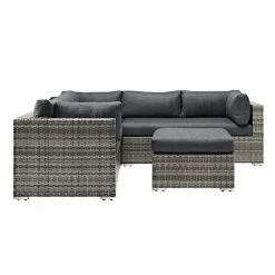 Kick up your feet and lounge in the open air with the Walker Edison 4-Piece Multi-Shade Rattan Patio Sectional with Cushions. This handsome sectional set includes two loveseats, a corner piece, and an ottoman, all made with a sturdy powder-coated metal frame wrapped in durable synthetic rattan material with a finish in varying shades of gray. Youโll be seated in comfort thanks to the setโs gray plush polyester cushions with removable covers for easy maintenance. The included ottoman gives you a cushy place to rest your legs, or provides additional seating for larger gatherings. This gorgeous set adds instant character to your outdoor entertaining area, and allows you to lounge in comfort and entertain in style.