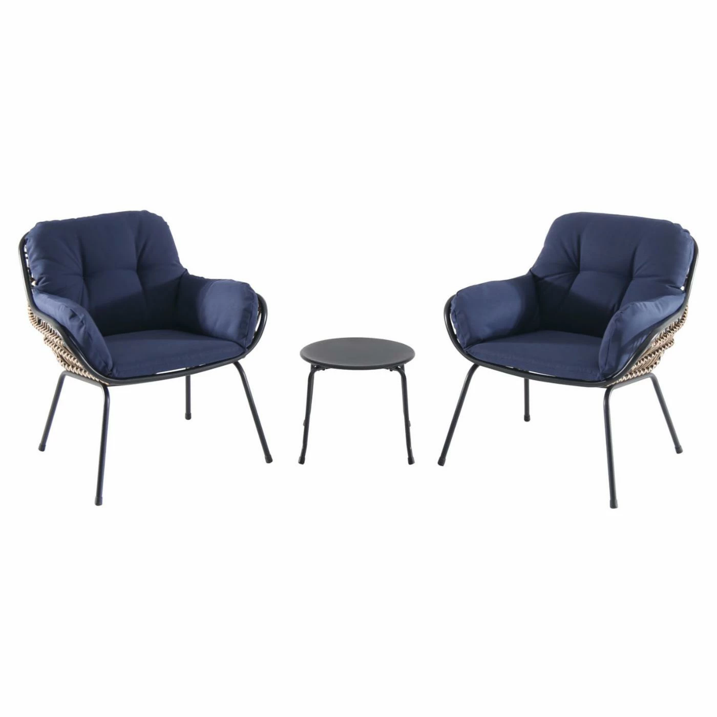 The plush, four-sided cushions included with the Hanover Naya Resin Wicker 3 Piece Patio Chat Set wrap you in comfort. Flared arms and an open all-weather wicker weave give the chairs in this set a clean, contemporary vibe. Slim steel frames are lightweight so they’re easy to move and feature a powder-coated black finish for contrast. This patio chat set includes two of these cushioned chairs and a matching black side table with round top. Settle in to sip and savor summer.