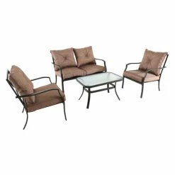 Your patio, balcony, deck, or terrace is about to see a lot more action. With the Hanover Palm Bay 4 Piece Patio Conversation Set, you can entertain and relax outdoors to take advantage of the views and garden you work so hard for. Simple lines and neutral colors fit in with any type of dรฉcor and won’t seem passรฉ in years to come. Button-tufted backrest cushions are generously stuffed. Cushions feature soft, durable all-weather fabric in tan. The steel frames have rust-resistant coatings and are heavy enough to withstand gusts of wind.