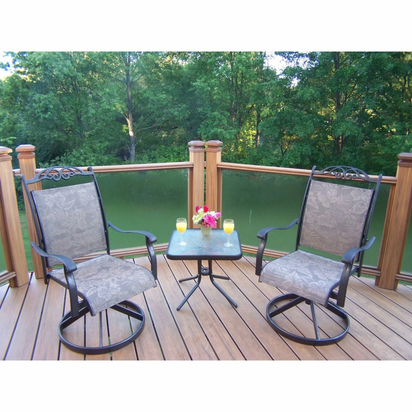 When you and your partner want to enjoy the views from your patio or deck, the Oakland Living Cascade Swivel Chat Set is the perfect vehicle. Morning mimosas, evening sunsets, or tete-a-tetes any time of day can all be enjoyed in these comfortable swivel chairs. With the convenient side table, everything you need is close at hand. Part of the Sling collection by Oakland Living, the chairs are outfitted with durable sling material that securely cradles you while allowing your body to breath, and the stylish scrollwork on the seat back and the foliate design of the sling material will pair beautifully with any home exterior. This set is hand cast to ensure lasting quality with an attractive coffee-colored finish that won’t fade, chip, or crack. Cheers!