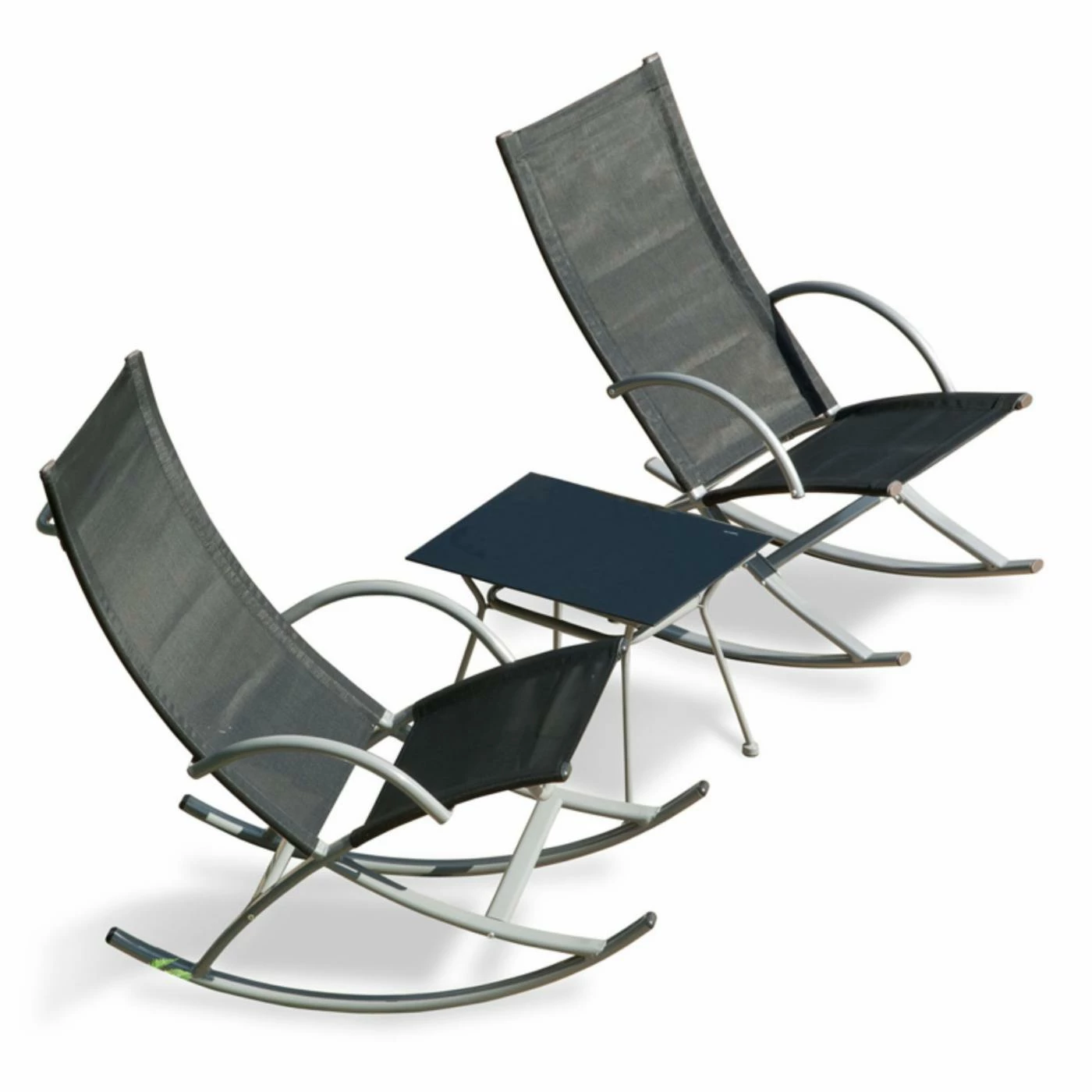 Get lost in a good book or enjoy poolside conversation in the Transcontinental Outdoor 3 Piece Patio Rocking Chair Chat Set. With a sleek and contemporary style, this classic rocking chair set is a conversation starter in its own right. Designed with the outdoors in mind, weather-resistant textilene fabric seats are both durable and comfortable. To ensure long-lasting use, the chairs and table frames are constructed from strong powder coated steel frames. The black finish makes this set an easy match for any contemporary decor. Add a blanket or some outdoor throw pillows for a pop of color, and then sit back, relax, and enjoy!