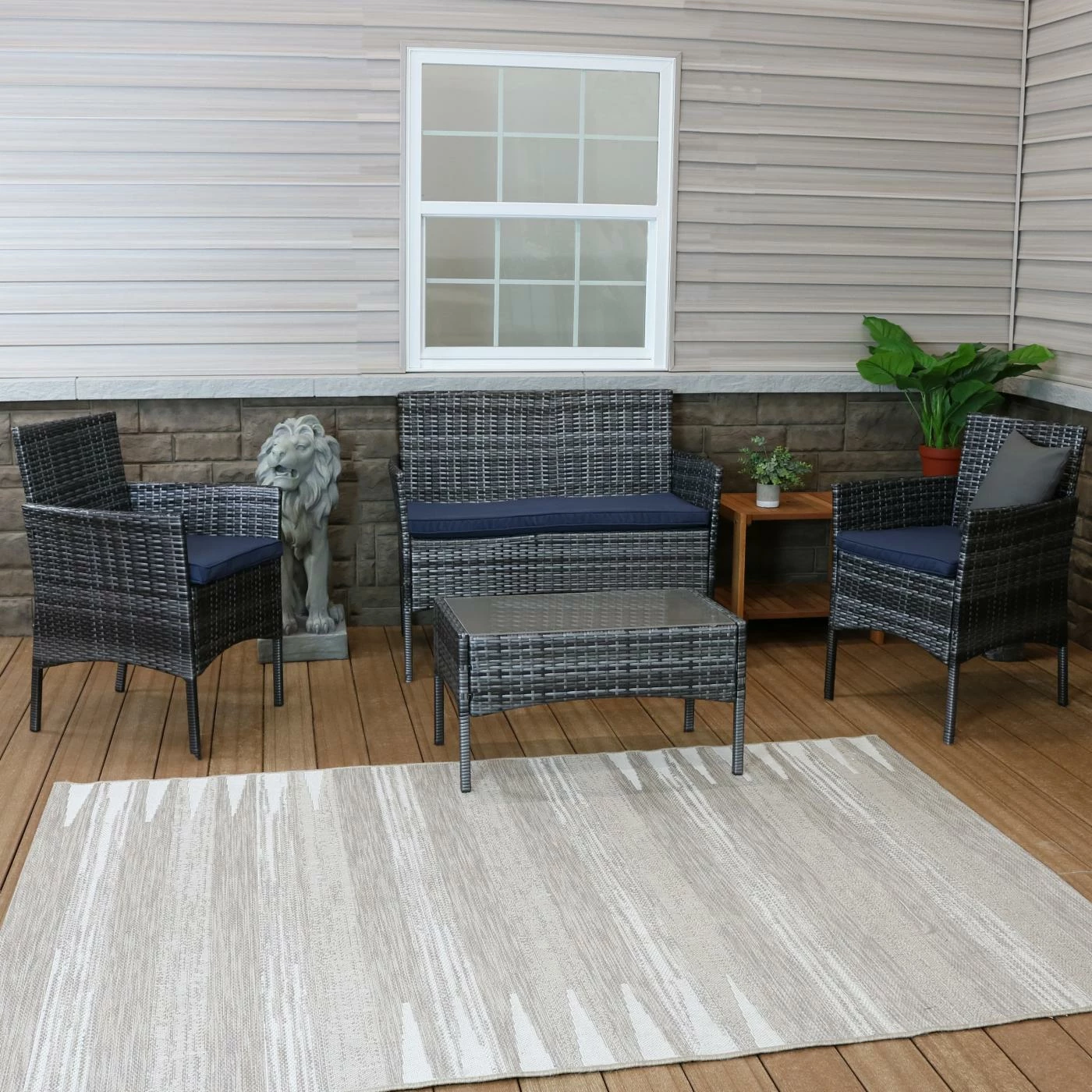 Enjoy a warm sunny day relaxing in your yard or garden while lounging on the Dunmore 4-Piece Outdoor Conversation Set from Sunnydaze Decor. This stylish furniture has the look of traditional wicker, but is made with modern materials. It features a durable powder-coated steel frame wrapped in polyrattan that is smooth to the touch and wont splinter. The cushions feature strong and easy-to-maintain polyester fabric with plush foam padding inside. Easily set down and serve your favorite snacks and beverages on top of the coffee table which features an attractive frosted glass tabletop.