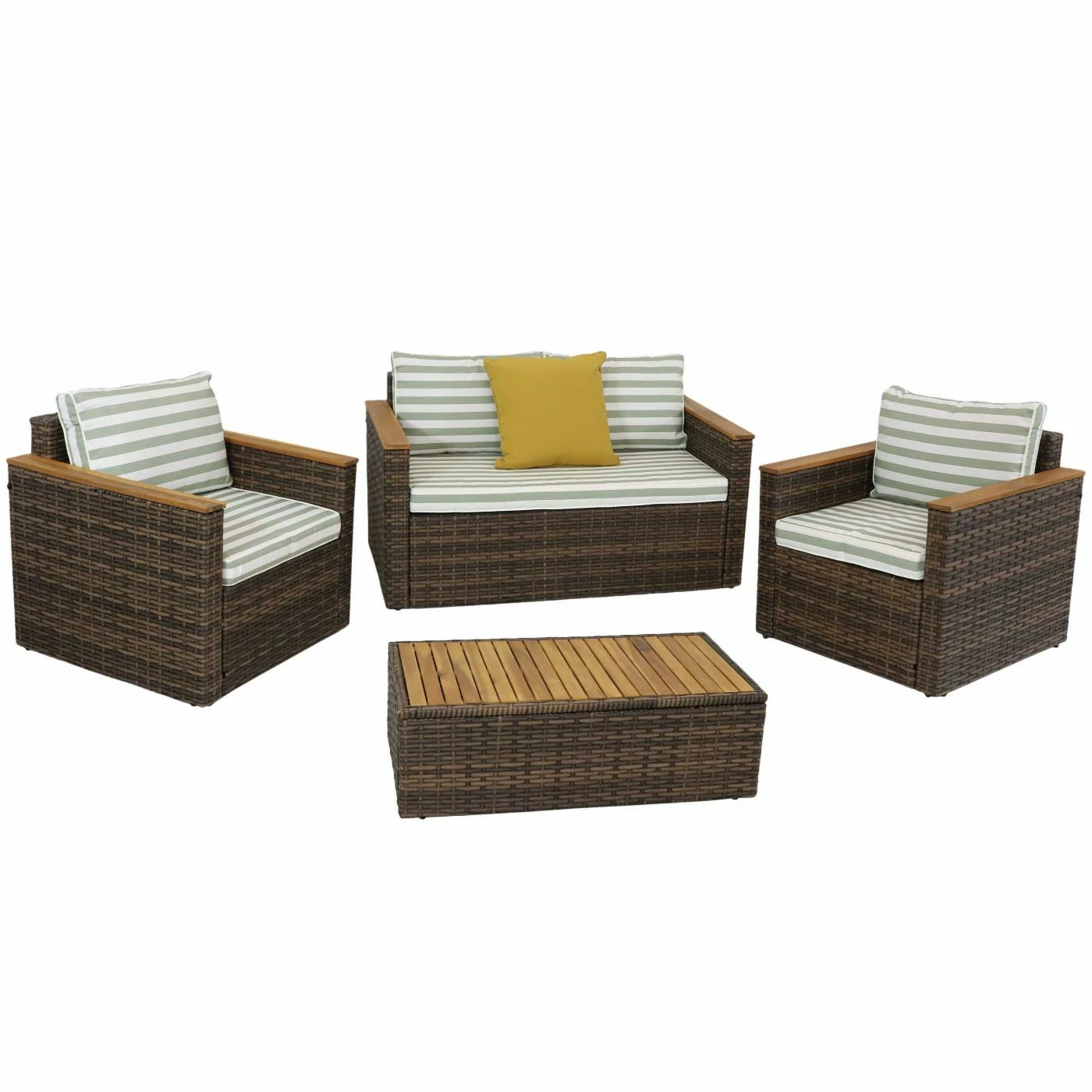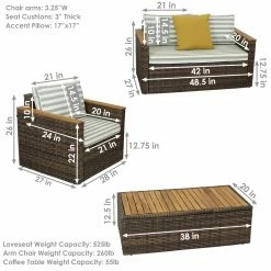 Lounge outdoors in contemporary style with friends and family to enjoy warm and sunny days with the Kenmare 4-piece outdoor conversation patio set. This complete set includes 1 loveseat to share with your best friend, 2 armchairs with cushions for added comfort while sitting down, and 1 coffee table for your convenience! The coffee table is the perfect place to set down books, magazines, drinks and other items used to rest and relax outdoors or by the pool. Durably constructed with a powder-coated steel frame wrapped in resin wicker, this outdoor furniture set is designed to endure the elements. The resin wicker wont chip or break easily under pressure compared to its natural counterpart. The arms on the chairs and loveseat, plus the tabletop on the coffee table, feature beautiful acacia wood which lends natural appeal to these pieces. Everything needed to assemble and put together this furniture is in the box, including the tools and hardware.